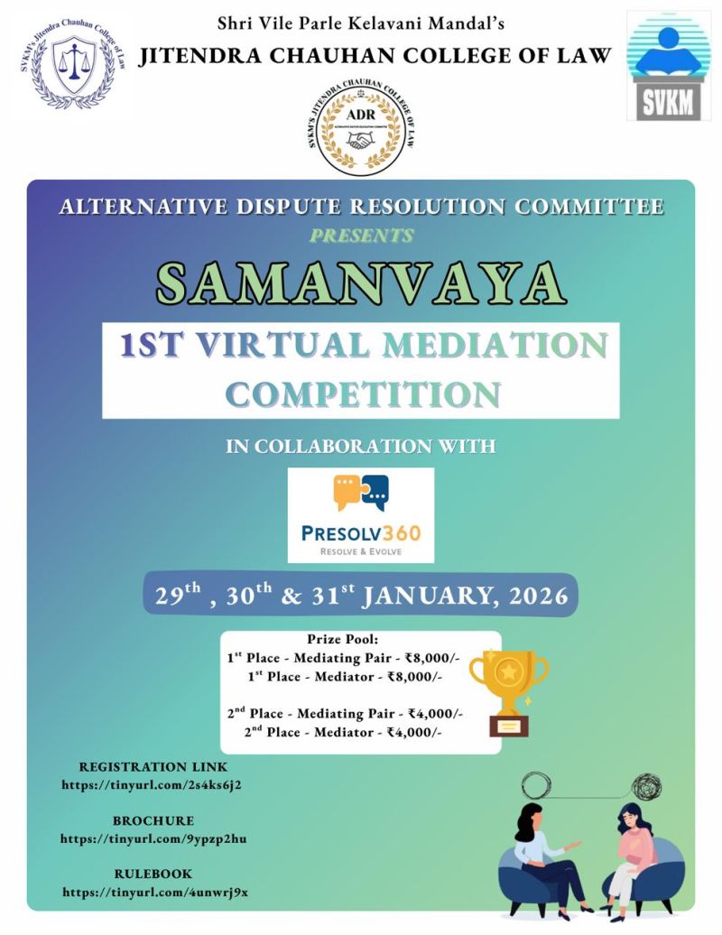 The Alternative Dispute Resolution Committee of SVKM’s Jitendra Chauhan College of Law is pleased to announce “Samanvaya”, its 1st Virtual Mediation Competition. The competition aims to provide an enriching platform for law students to demonstrate negotiation skills, strategic thinking, creativity, and effective communication in the field of mediation.