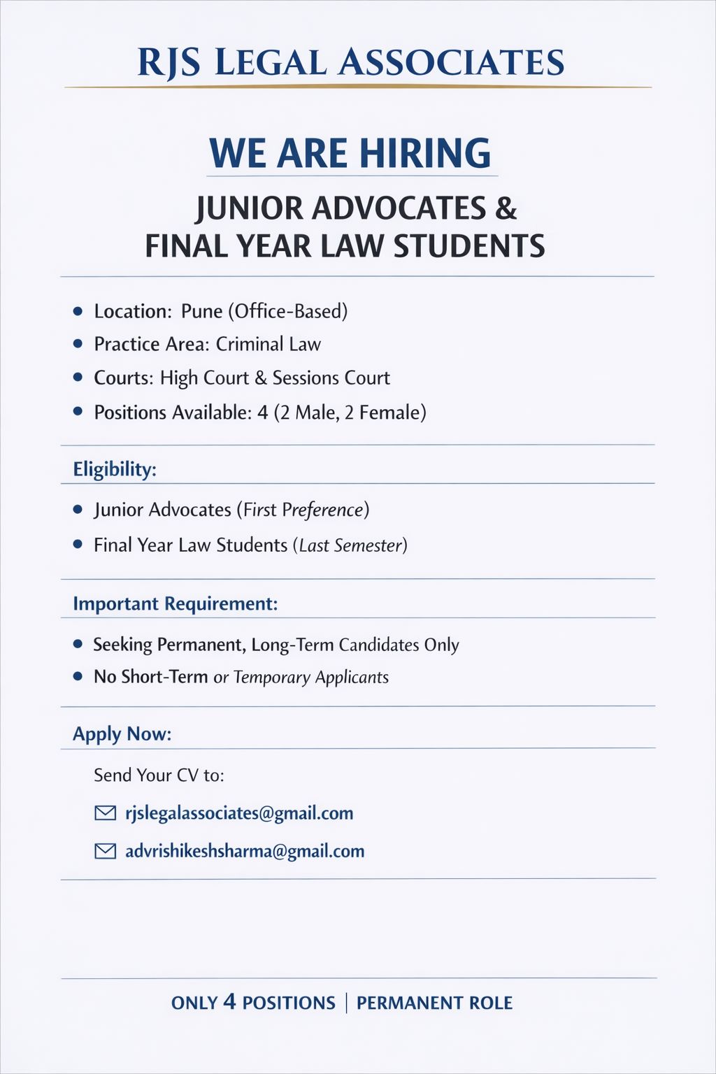 RJS Legal Associates is inviting applications to join its litigation team in Pune, with a core focus on criminal law practice and regular appearances before the High Court and Sessions Court. This opportunity is designed for individuals committed to building a long-term career in courtroom litigation.