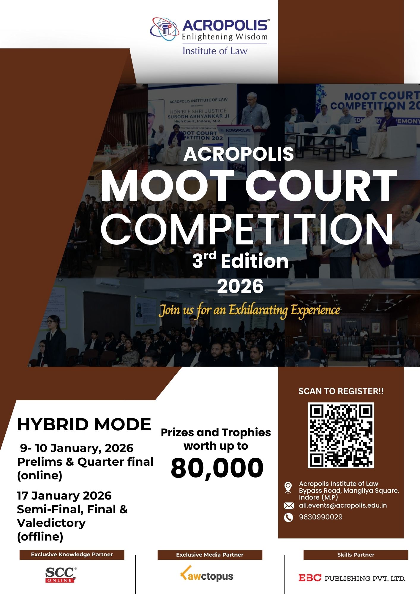 In the field of professional Education based at Indore at central Part of India. Established in the Year of 2005, we are among the top institutes in Madhya Pradesh With 22000+ students actively studying in the field of Engineering, Management, Computers Application, Pharmacy, Science, Commerce, Arts and Law. The Acropolis Institute of Law is Approved by the Bar Council of India and Affiliated to Devi Ahilya Vishwavidyalaya, Indore M.P. Since the inception we have been focusing on quality education to the students with the support of qualified and expedial learning Law Program Aims to add new dimensions in legal education and to provide an environment for innovation in the legal field. In the Alignment of our vision Acropolis Moot Court Committee has Announced 3rd Edition of Acropolis Moot Court Competition, 2026
