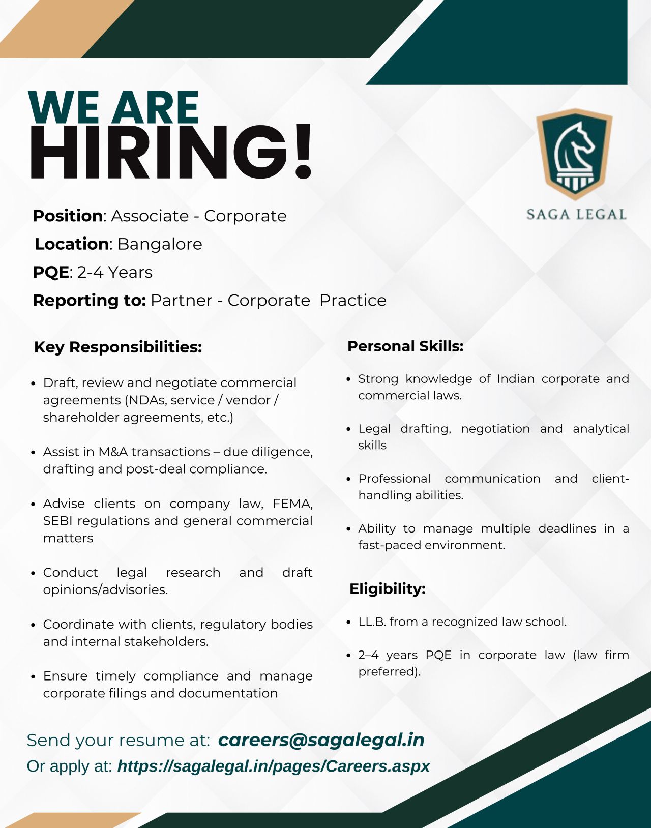 Saga Legal is looking to onboard an Associate for its Corporate Practice in Bangalore.