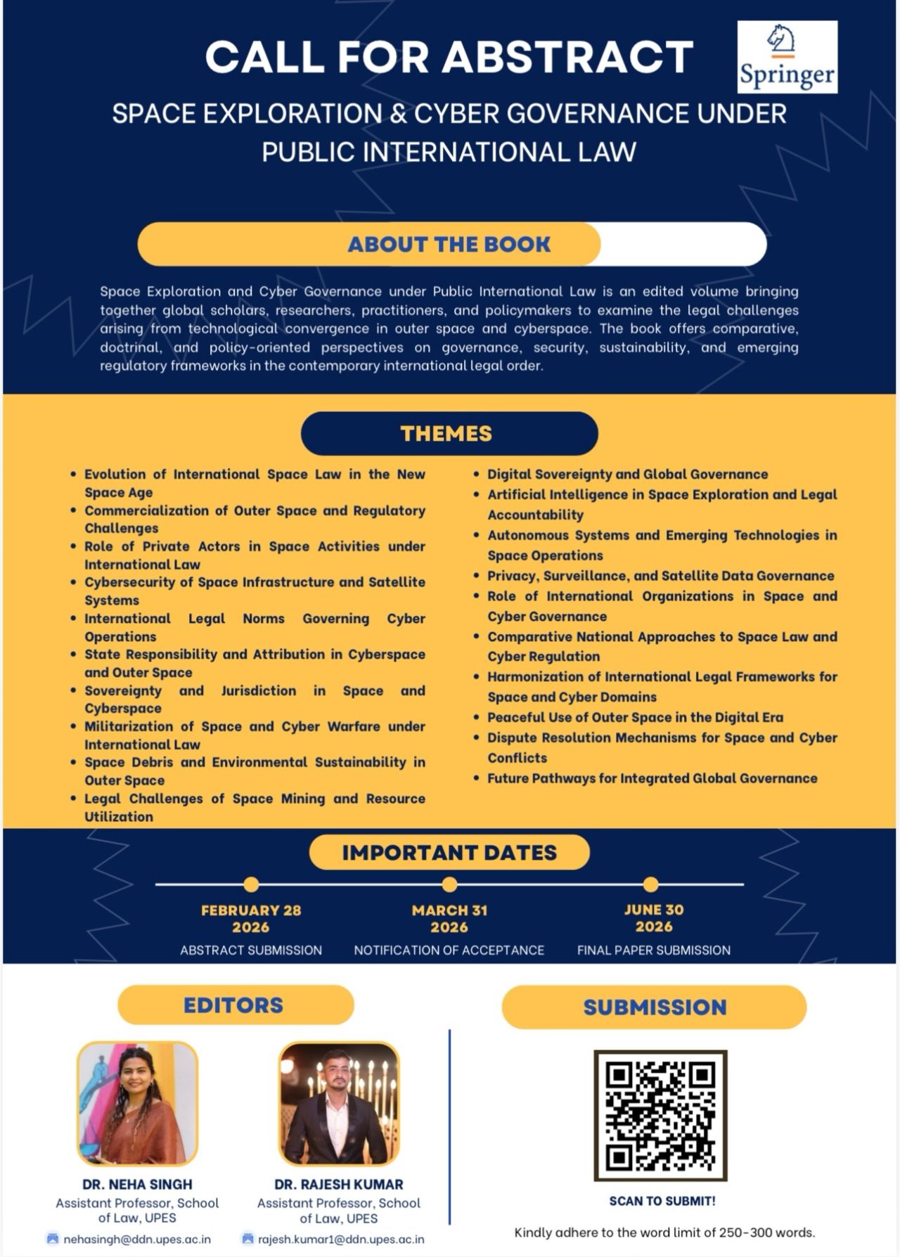 This edited collection examines the evolving challenges of space exploration and cyber governance through the lens of Public International Law. The volume seeks to engage with doctrinal developments, policy debates, and emerging regulatory frameworks governing outer space activities and cyberspace.