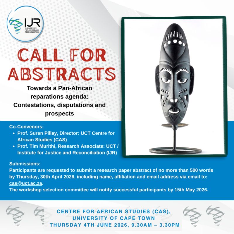 Applications are invited for submission of abstracts for a research workshop titled “Towards a Pan-African Reparations Agenda: Contestations, Disputations and Prospects.” The workshop will be convened at the Centre for African Studies (CAS), University of Cape Town, South Africa, and aims to provide a platform for academic engagement on reparative justice and related global movements.