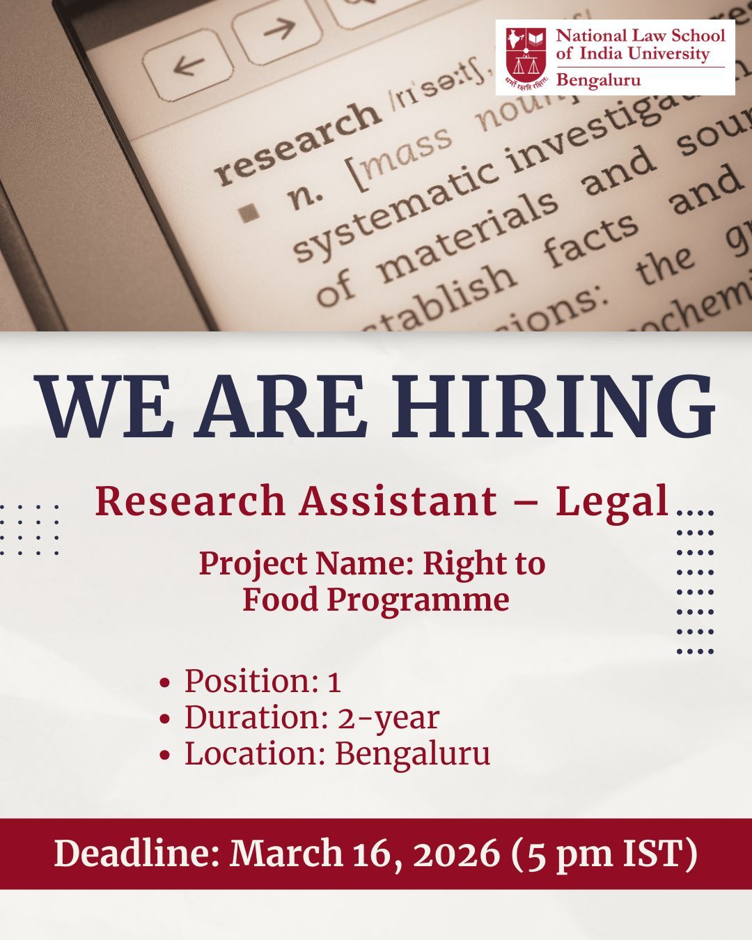 The Centre for Child and the Law at the National Law School of India University (NLSIU) is inviting applications for the position of Research Assistant – Legal.