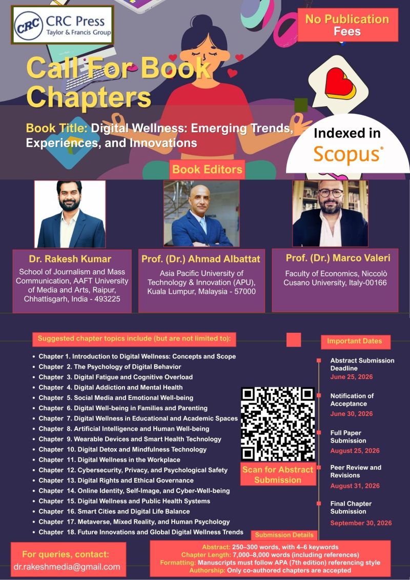 Submissions are invited for an edited volume titled “Digital Wellness: Emerging Trends, Experiences, and Innovations”, to be published by CRC Press (Taylor & Francis Group).