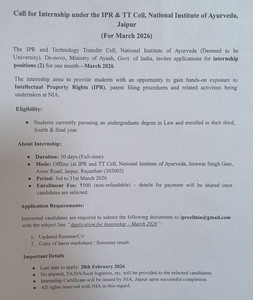 The IPR & Technology Transfer Cell, National Institute of Ayurveda (Deemed to be University), Ministry of AYUSH, invites applications for a one-month offline internship in IPR for March 2026.