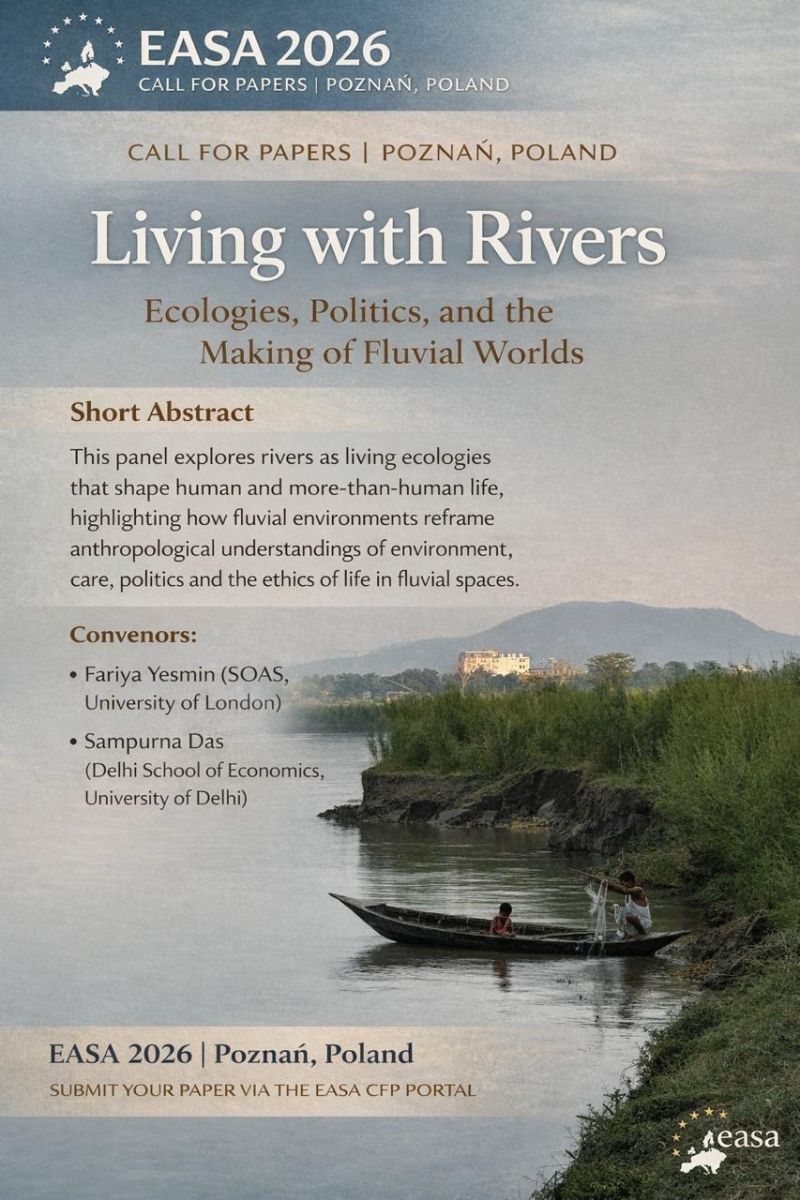 Paper submissions are invited for Panel 114: “Living with Rivers: Ecologies, Politics, and the Making of Fluvial Worlds” at the EASA 2026 Conference. The panel examines rivers as living ecologies that actively shape human and more-than-human life, politics, care practices, and ethical engagements in riverine and island landscapes.