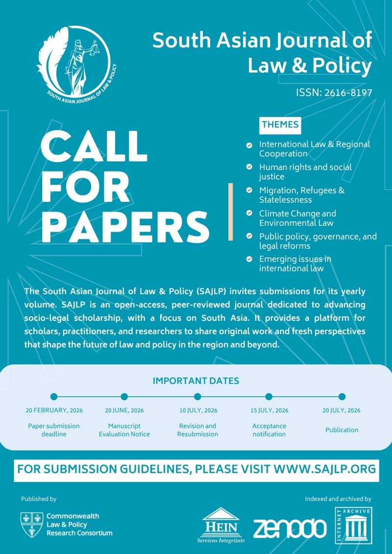 The South Asian Journal of Law & Policy (SAJLP) (ISSN: 2616-8197) is an open-access, peer-reviewed academic journal dedicated to advancing socio-legal scholarship with a strong focus on South Asia. The journal invites original research articles, critical analyses, and scholarly contributions addressing contemporary legal and policy challenges within South Asia and globally.