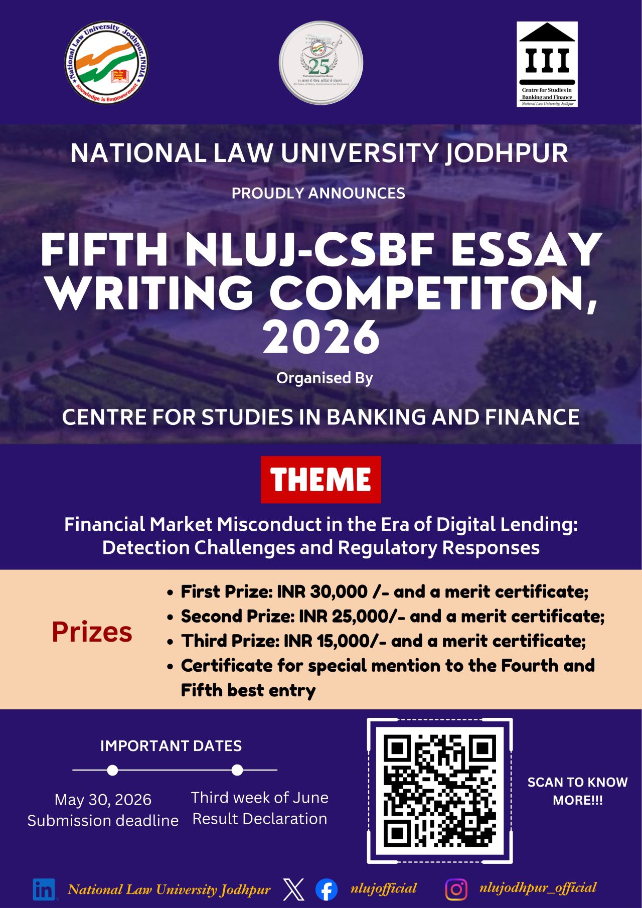 The Centre for Studies in Banking and Finance at National Law University Jodhpur is organising the Fifth NLUJ–CSBF Essay Writing Competition, 2026.