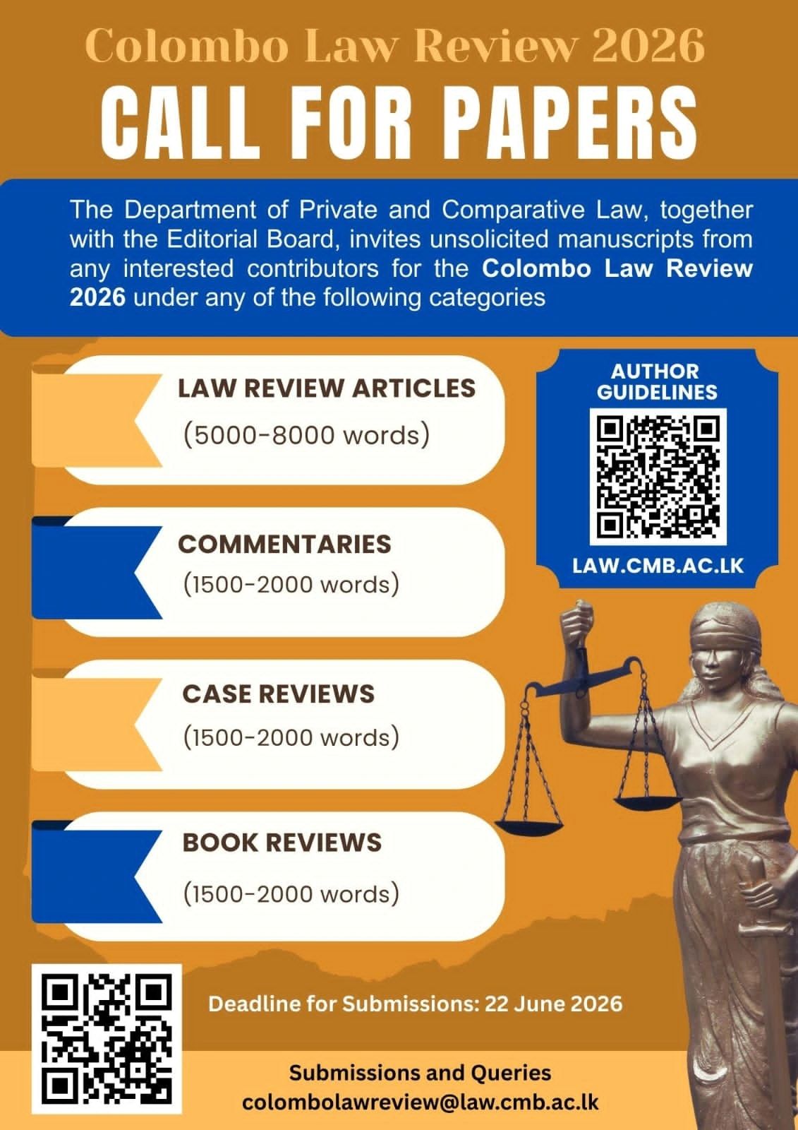 The Colombo Law Review invites submissions from academics, researchers, and legal practitioners for its upcoming issue. This is an opportunity to contribute to a platform committed to advancing rigorous, contemporary legal scholarship.