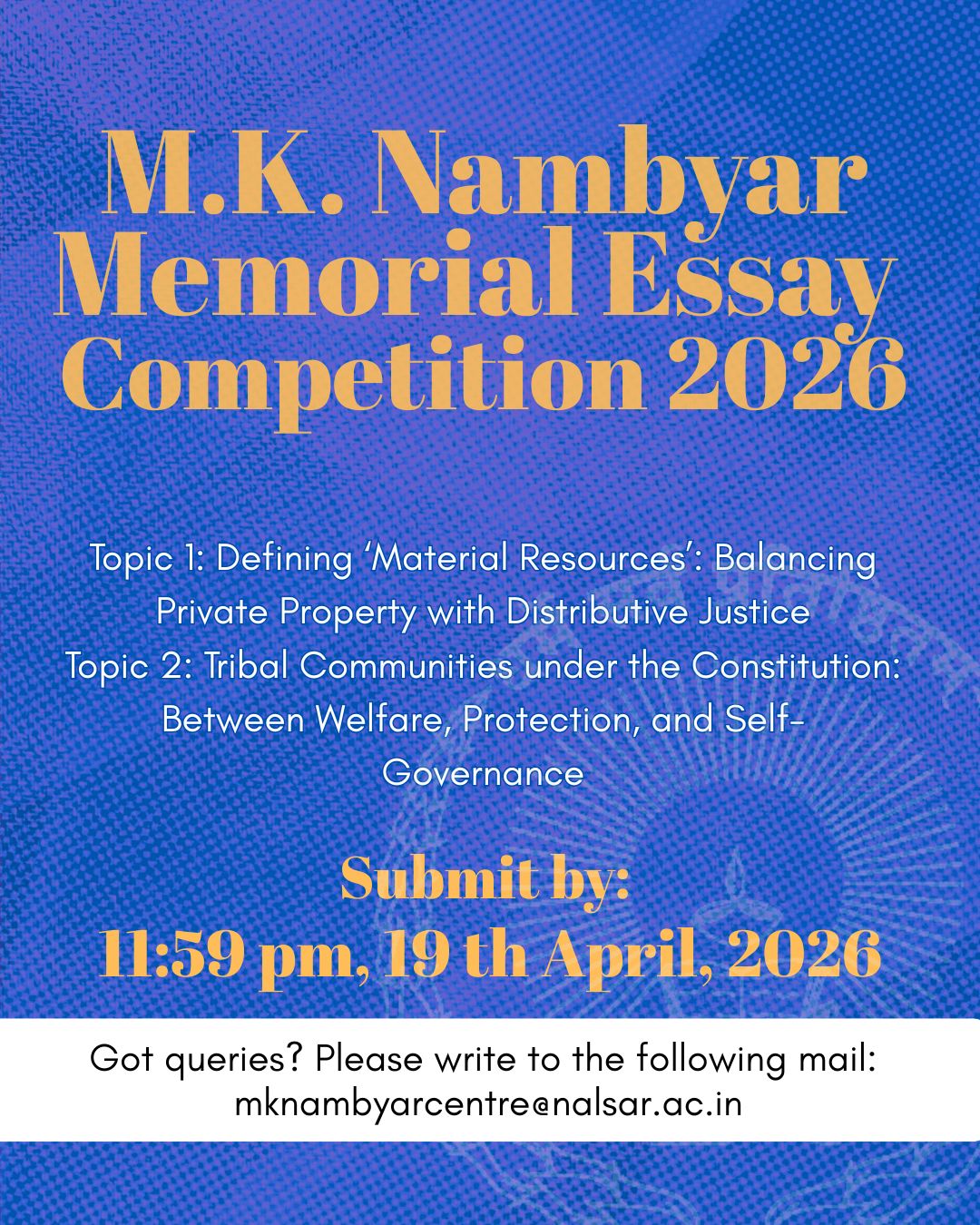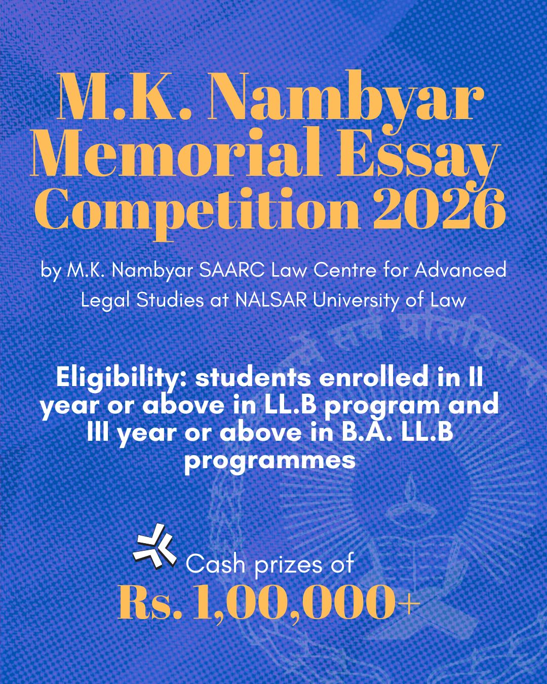 The M.K. Nambyar SAARC Law Centre for Advanced Legal Studies at NALSAR University of Law, Hyderabad, invites submissions for the M.K. Nambyar Memorial Essay Competition 2026.