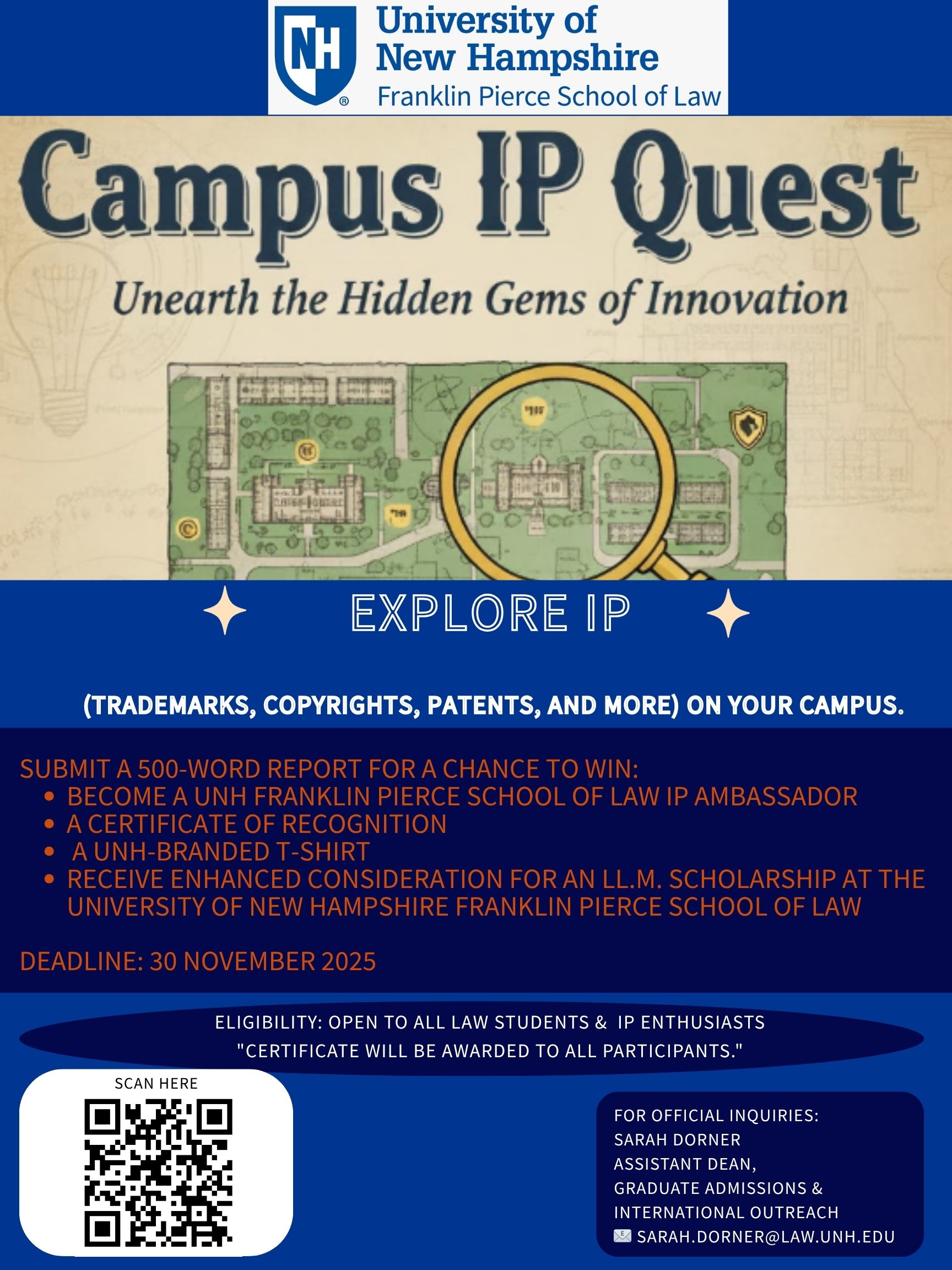 The Campus IP Quest is an exciting opportunity for all university students, especially those passionate about intellectual property (IP) to explore and showcase innovative ideas within the world of IP law. Hosted by the University of New Hampshire Franklin Pierce School of Law, this challenge invites you to unearth hidden gems of innovation right on your campus. Whether it’s a new patent, a creative trademark, or a breakthrough in copyright, we want to hear about it!