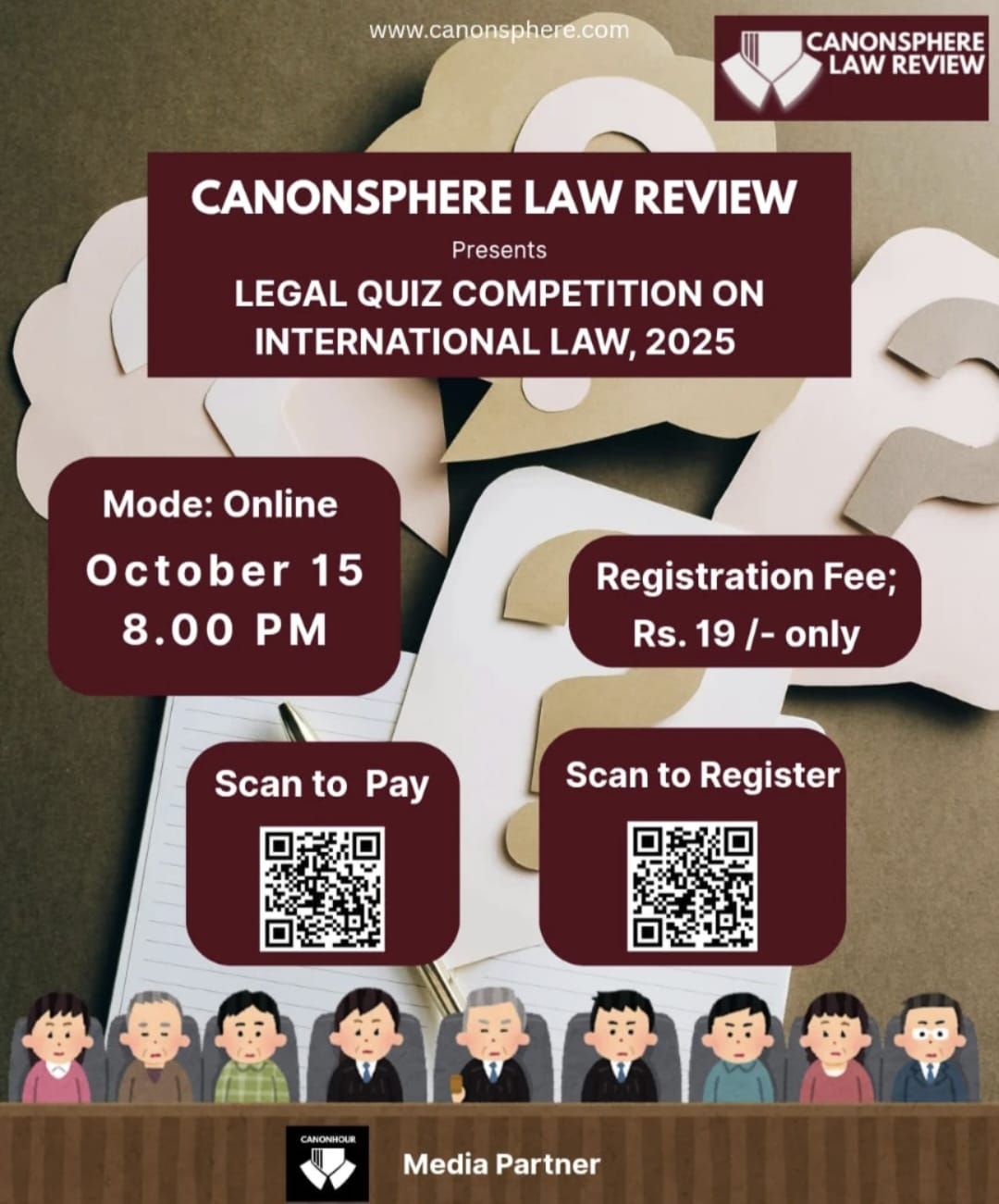Canonsphere is an innovative platform dedicated to fostering the growth and development of individuals in the legal field. We provide law students and professionals with dynamic opportunities to participate in debates, moot courts, drafting competitions, quizzes, and much more, in collaboration with like-minded organisations. Our platform is designed to empower individuals to create positive change and make a meaningful impact within the legal profession.