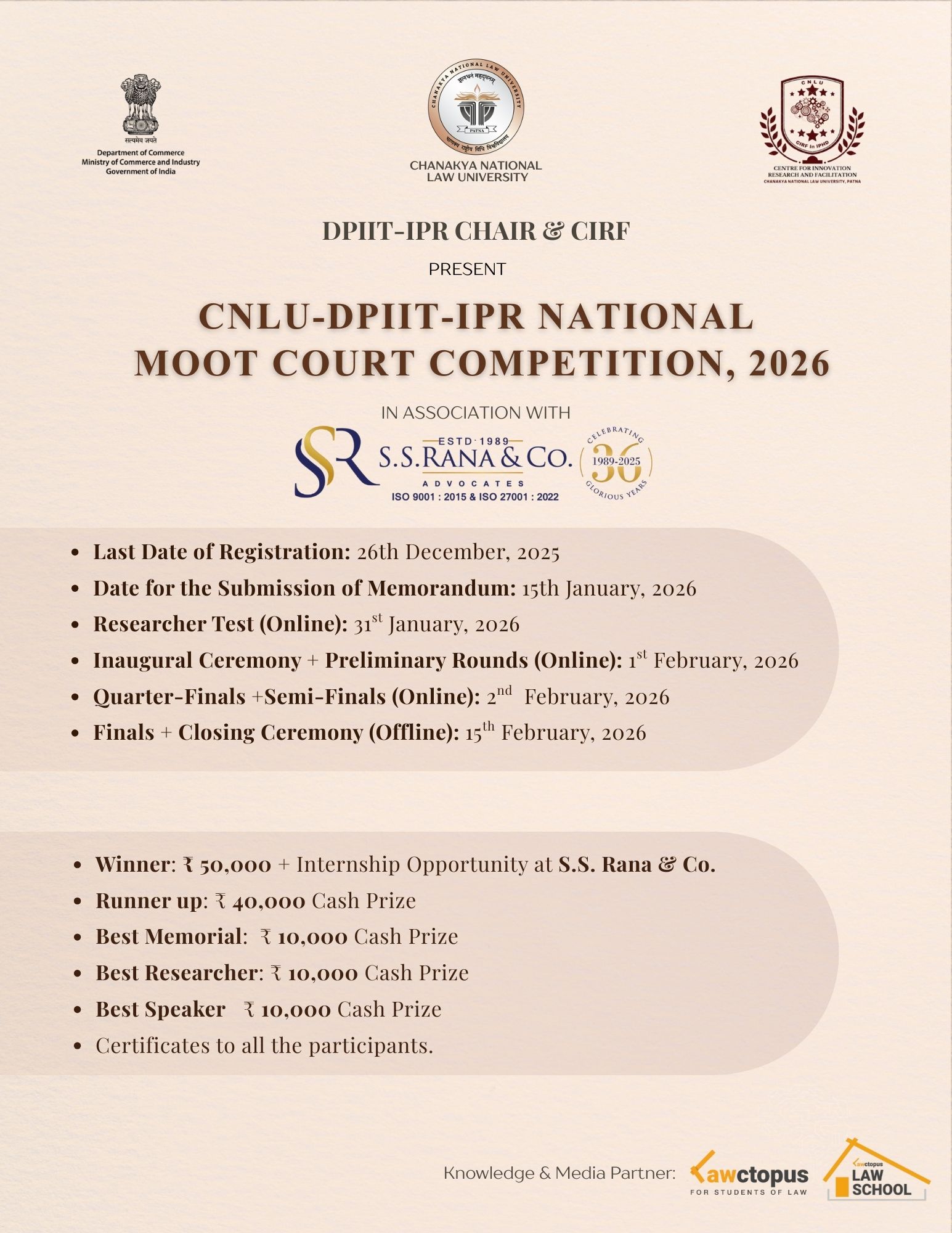 The DPIIT-IPR Chair & CIRF of Chanakya National Law University, Patna, in collaboration with S.S. Rana & Co., is thrilled to announce the CNLU-DPIIT-IPR National Moot Court Competition, 2026.