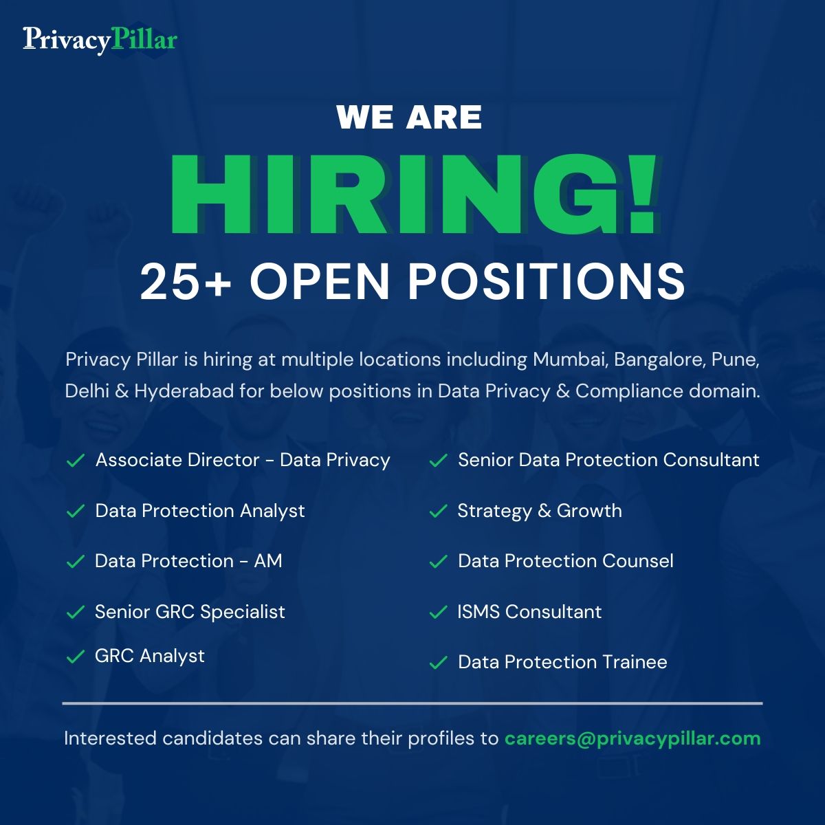 Privacy Pillar is expanding. We are hiring across Mumbai, Bangalore, Pune, Delhi, and Hyderabad, with 25+ open positions as we scale our Privacy-by-Design and compliance practice.