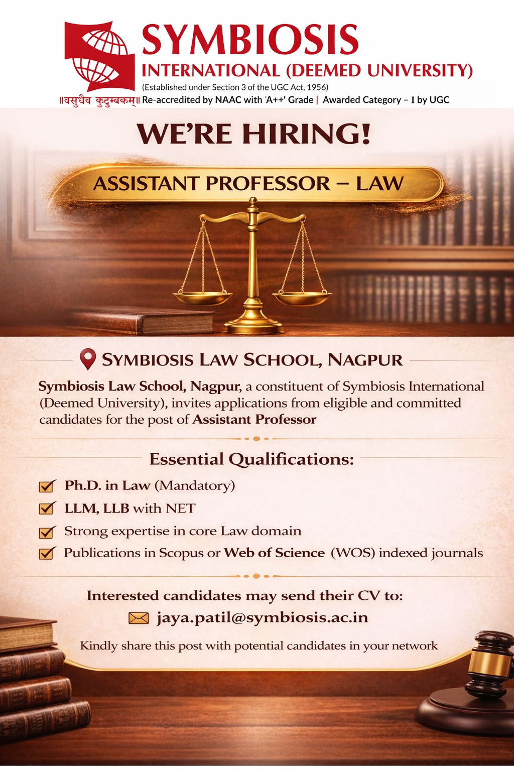 Symbiosis Law School, Nagpur, a constituent of Symbiosis International (Deemed University), is inviting applications from eligible and committed academicians for the position of Assistant Professor – Law.