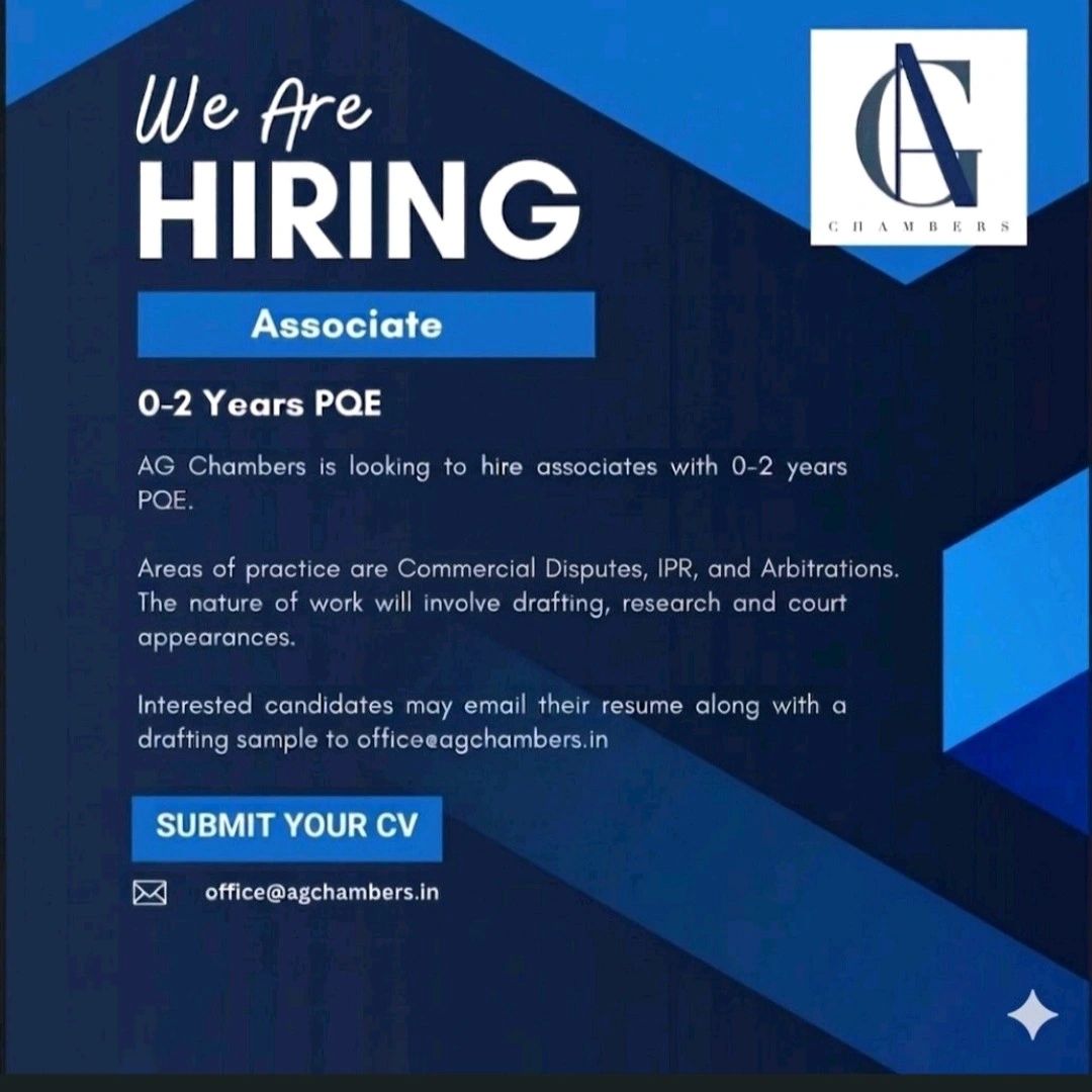 AG Chambers is hiring Associates with 0–2 years of post-qualification experience. The role offers exposure to commercial disputes, intellectual property, and arbitration work.