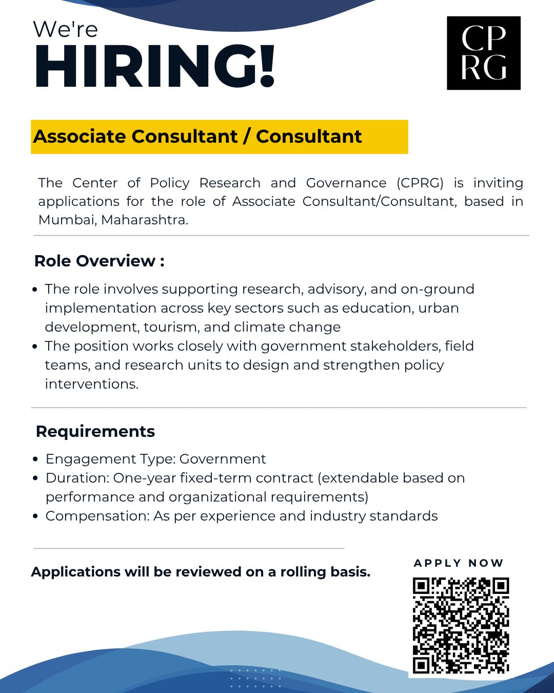 Center of Policy Research and Governance (CPRG) is inviting applications for the role of Associate Consultant / Consultant. This opportunity is suited for candidates interested in public policy, governance, and consulting work.