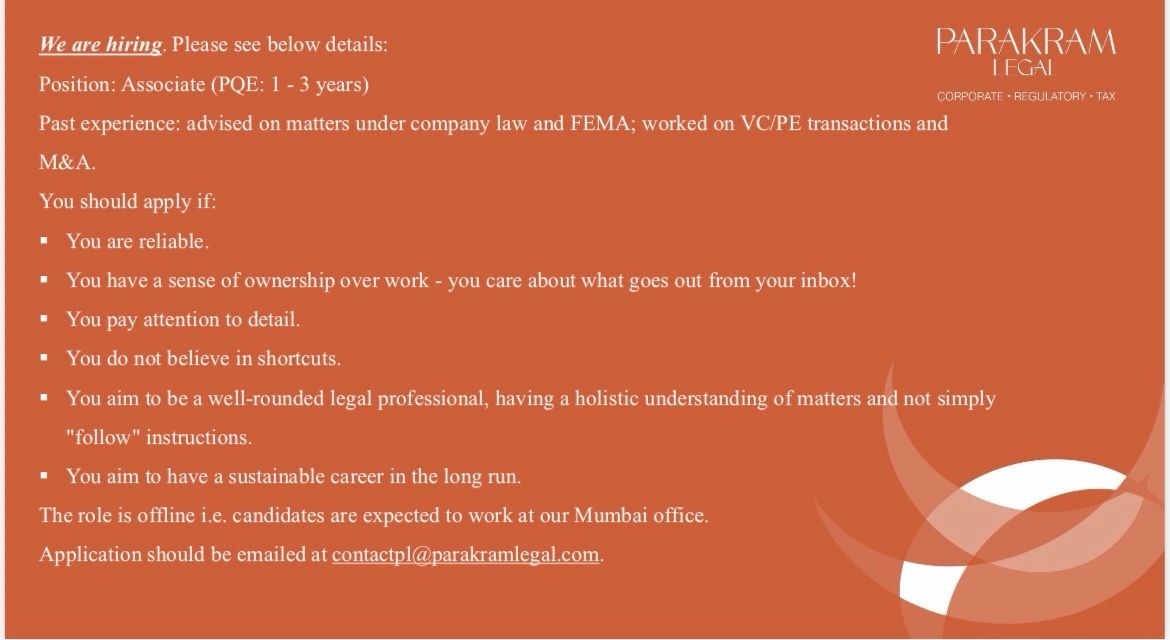 Parakram Legal, led by Jenisha Parikh, is hiring an Associate for its corporate and regulatory practice. The role focuses on company law, FEMA advisory, and transactional work including VC/PE and M&A.