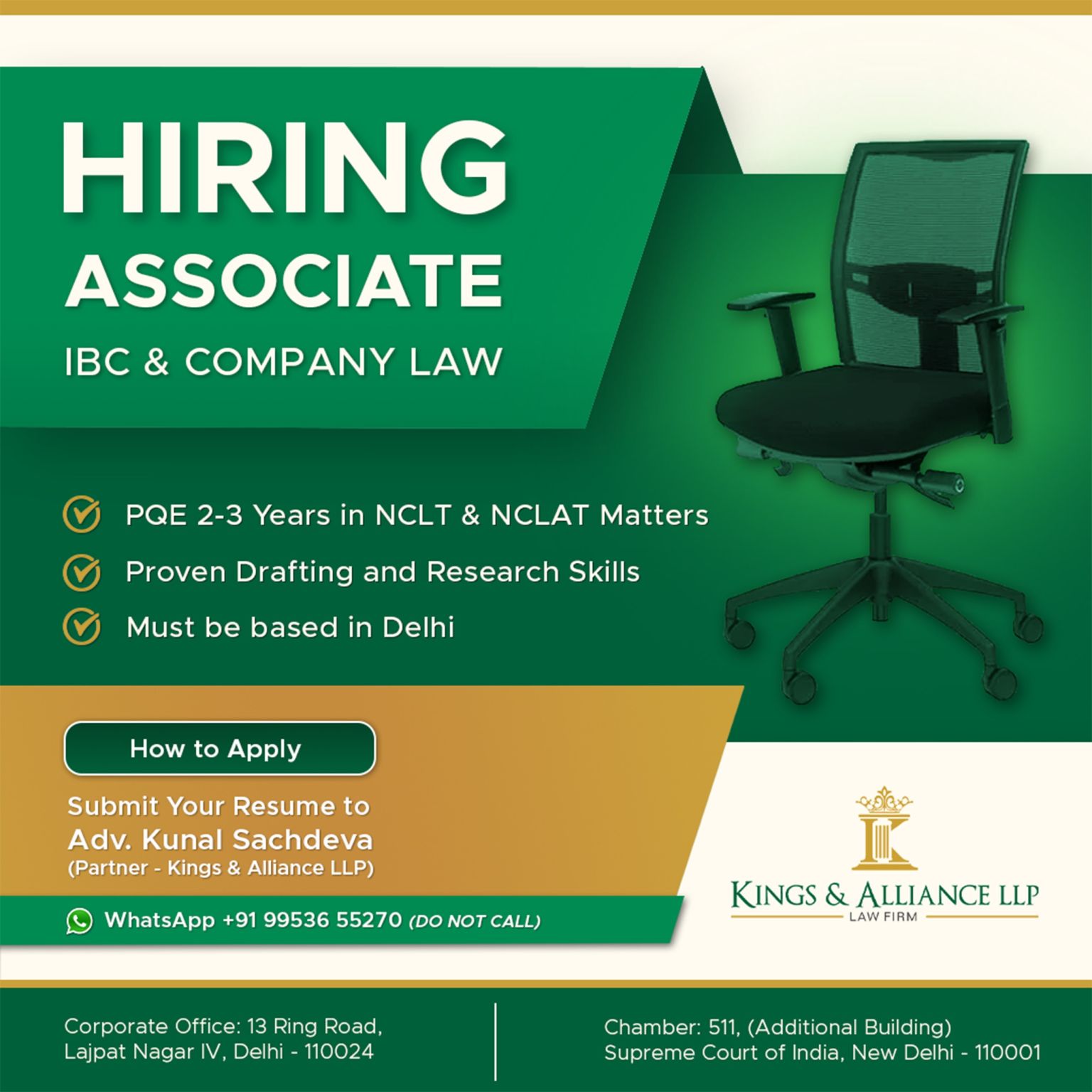 Kings & Alliance LLP is looking to onboard an Associate with a focused practice in Insolvency & Bankruptcy Code (IBC) and Company Law.