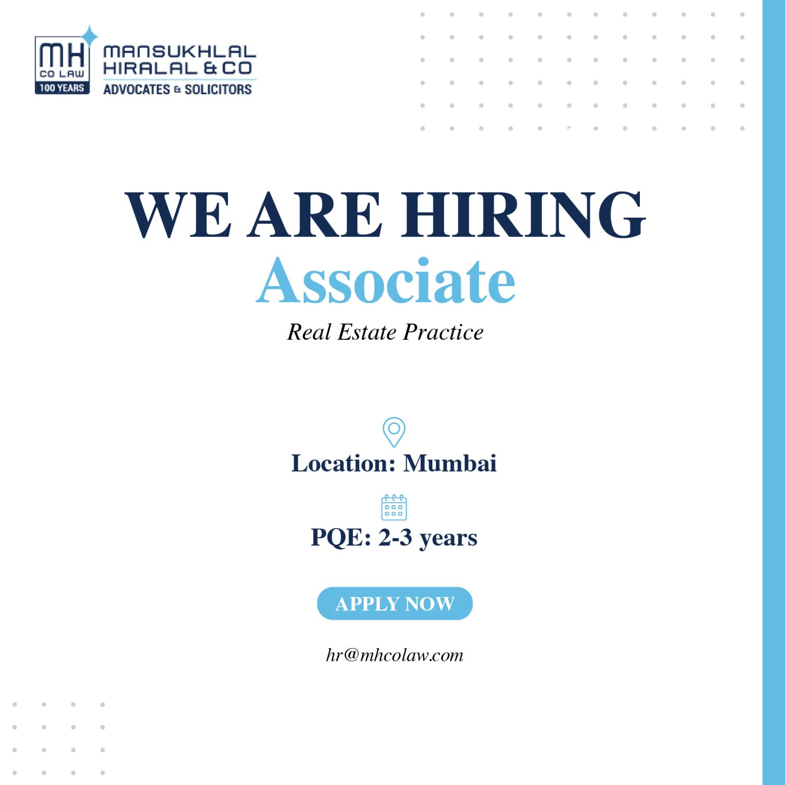 Mansukhlal Hiralal & Co is inviting applications for the position of Associate to join its Real Estate Practice. The firm is looking for lawyers with relevant experience who are interested in working on real estate transactions and related advisory matters within a professional and growth-oriented environment.