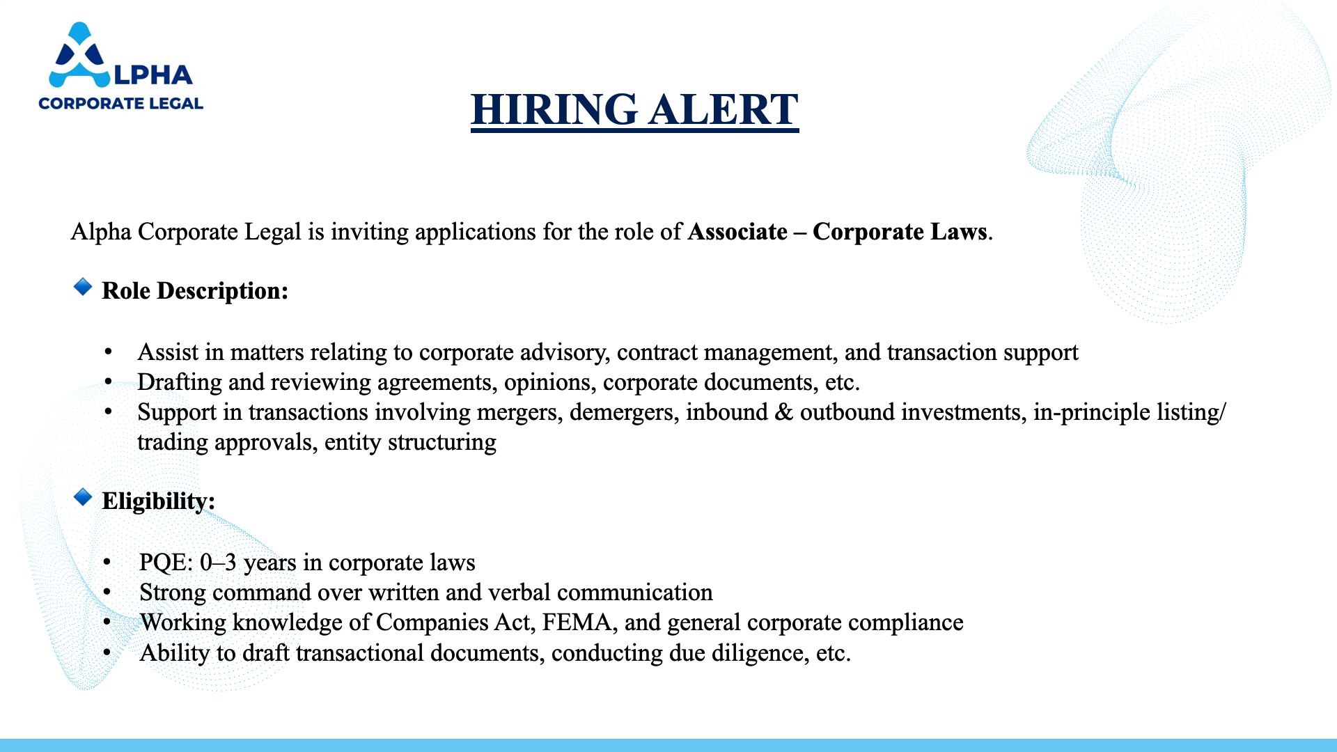 Alpha Corporate Legal is expanding its team and inviting applications from motivated Lawyers and Company Secretaries with 0–3 years of experience in corporate laws.