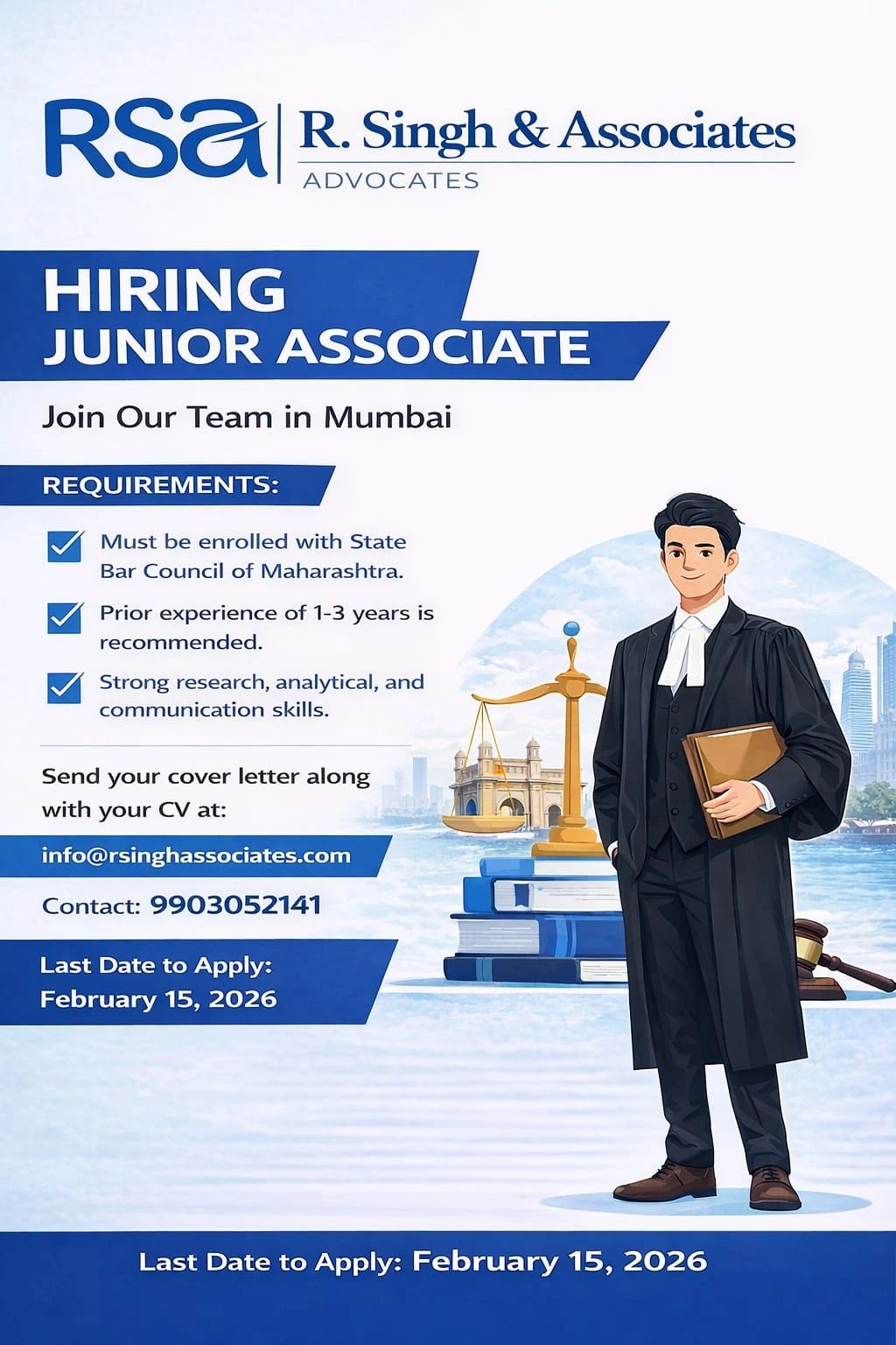 R. Singh & Associates (RSA) is inviting applications for the position of Legal Associate at its Mumbai office.