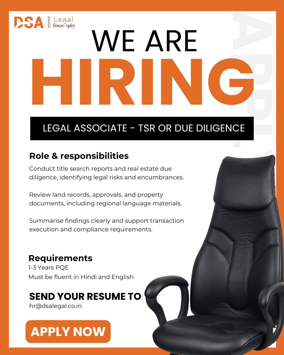 DSA Legal is hiring Legal Associates with experience in Title Search Reports (TSR) and property due diligence. This role is ideal for professionals with a background in real estate transactions and land record analysis.