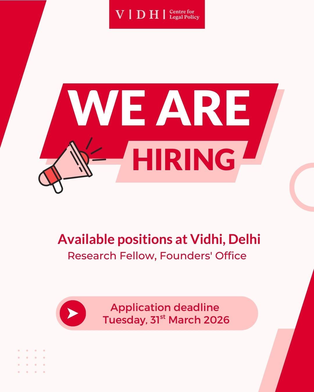 The Vidhi Centre for Legal Policy is inviting applications for the position of Research Fellows to work with the Founders’ Office. This role offers an opportunity to engage closely with the leadership of one of India’s leading legal policy think tanks and contribute to research and institutional initiatives that shape law and public policy in India.