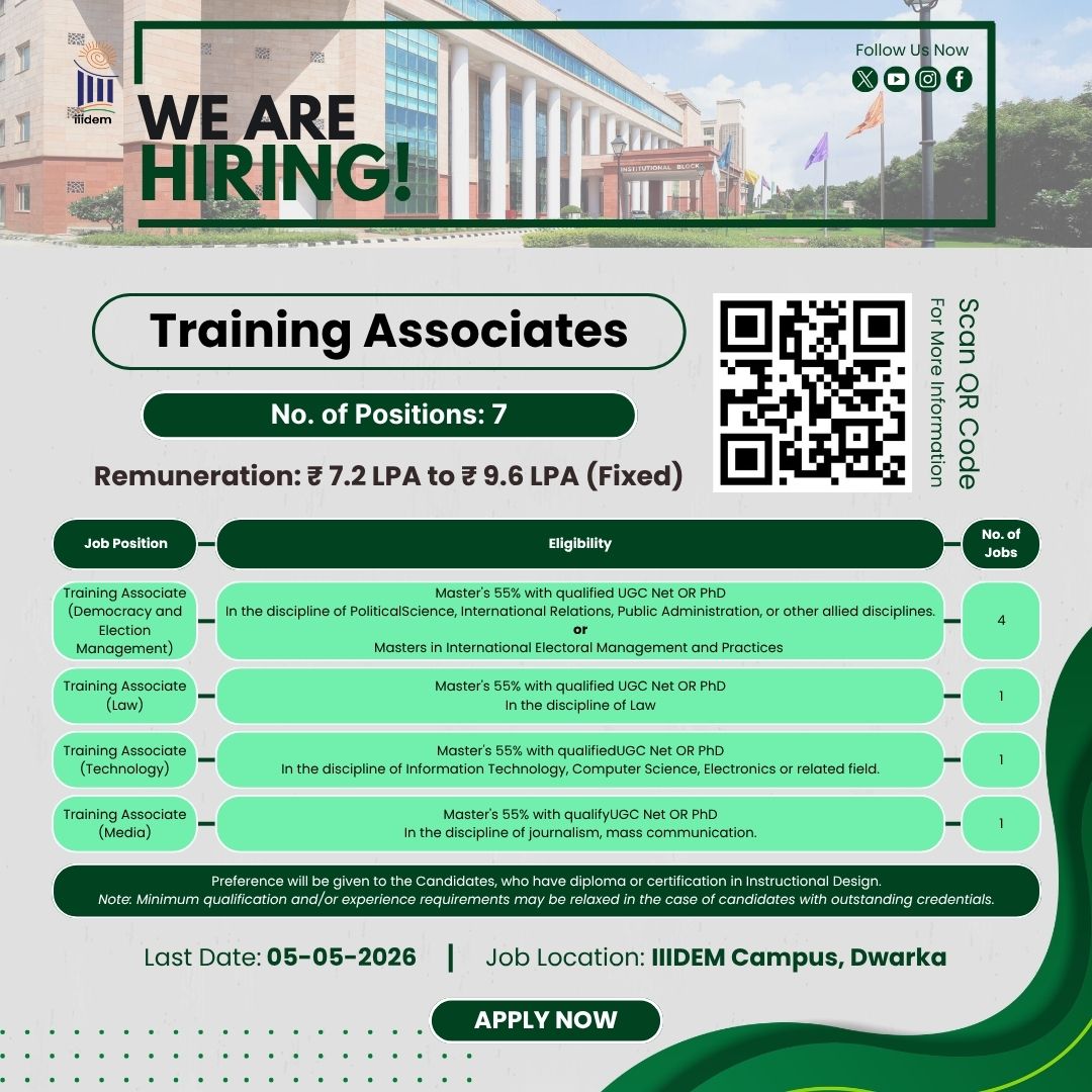 India International Institute of Democracy and Election Management (IIIDEM) is inviting applications for Training Associates across multiple domains. The role focuses on training, research, and capacity-building in democracy and election management.