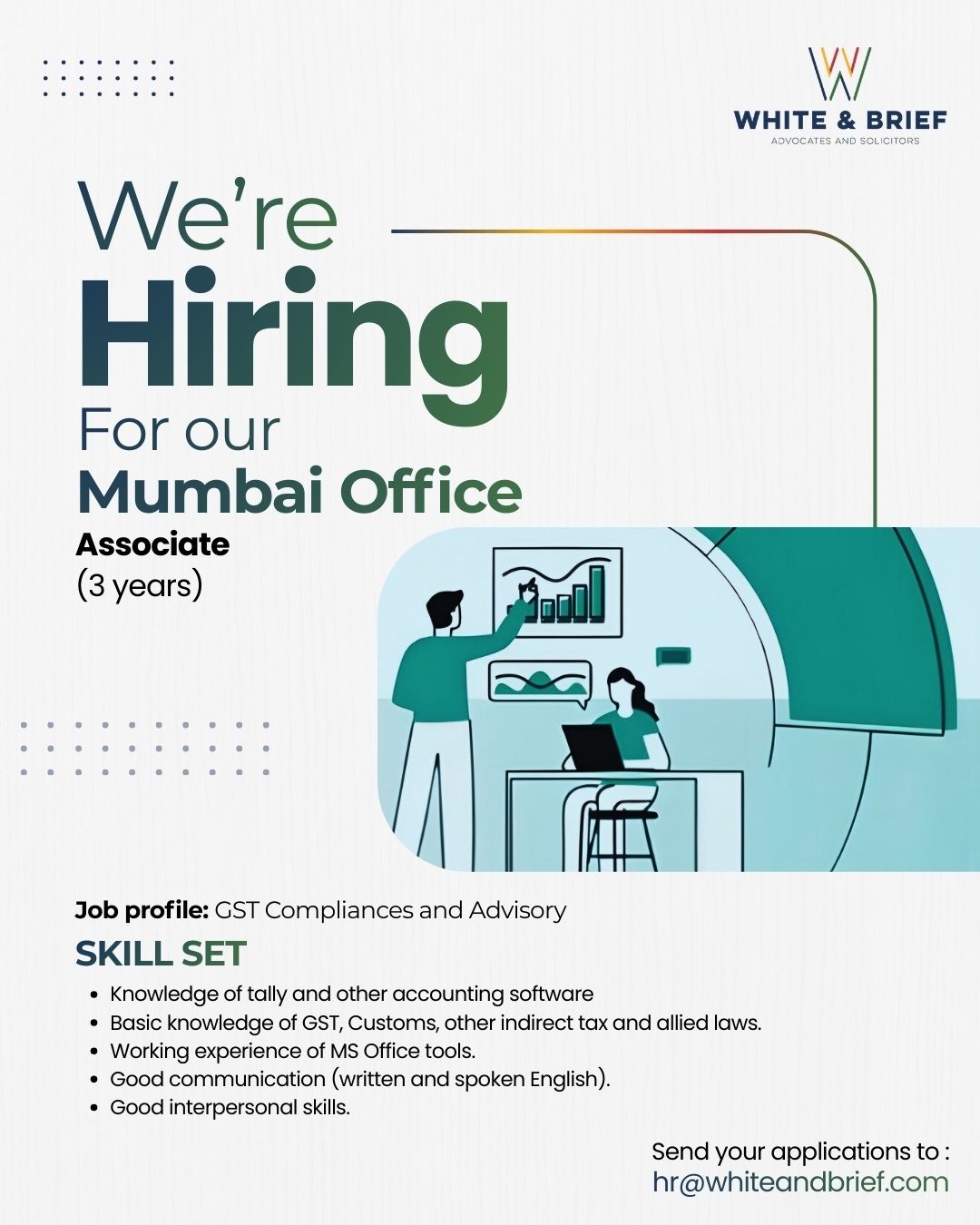 White & Brief – Advocates and Solicitors is inviting applications for the position of Associate to join its GST Compliance & Advisory team in Mumbai. This opportunity is suited for professionals interested in working on indirect tax compliance and advisory assignments within a law firm environment.