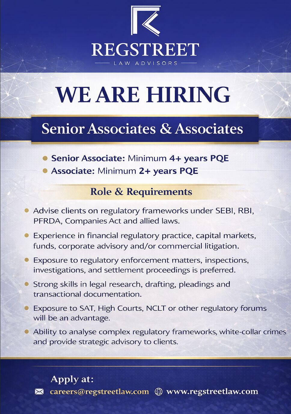 Selected candidates will assist the firm in advising clients on regulatory frameworks governed by SEBI, the Reserve Bank of India (RBI), the Pension Fund Regulatory and Development Authority (PFRDA), the Insurance Regulatory and Development Authority of India (IRDAI), and the Companies Act.