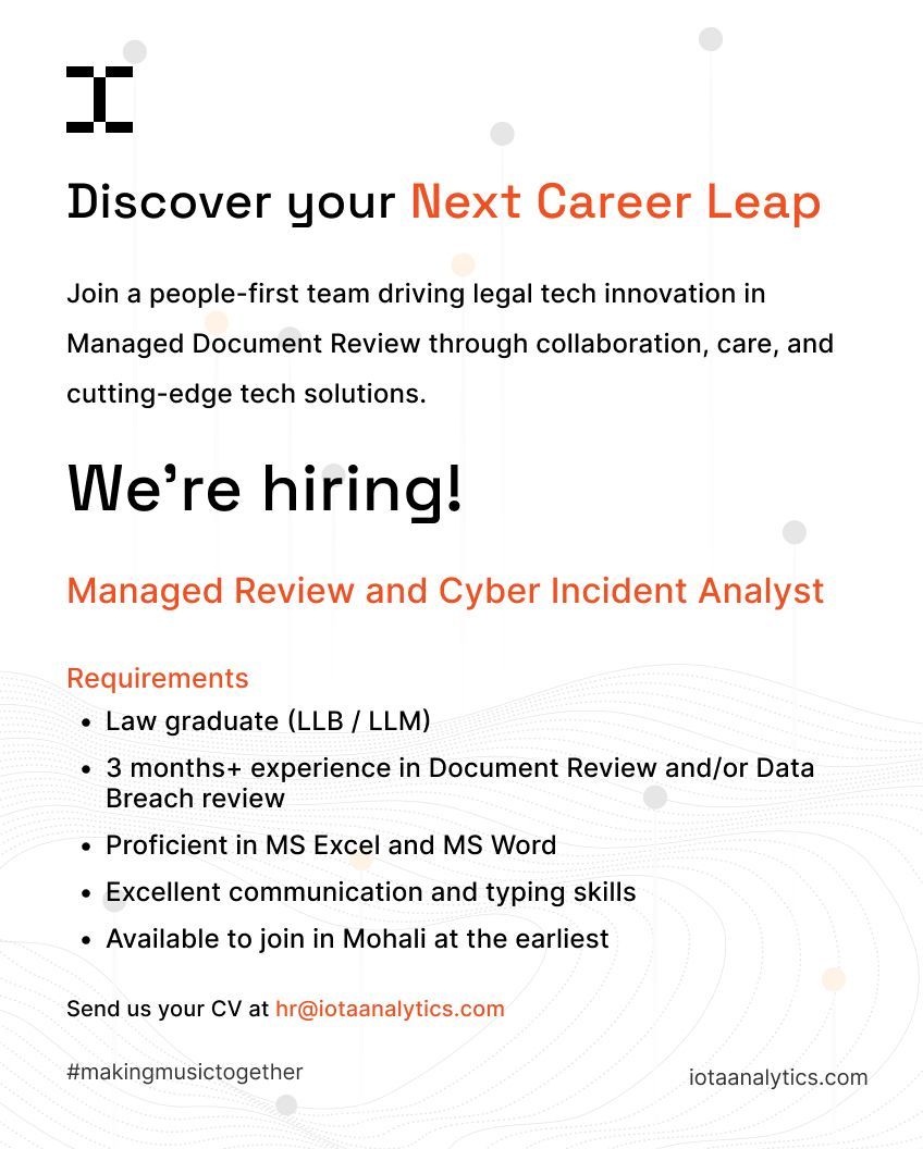 Iota Analytics is inviting applications for the position of Legal Associates on a contractual basis. This opportunity is suited for candidates seeking short-term exposure in document review and legal support work within a professional setup.