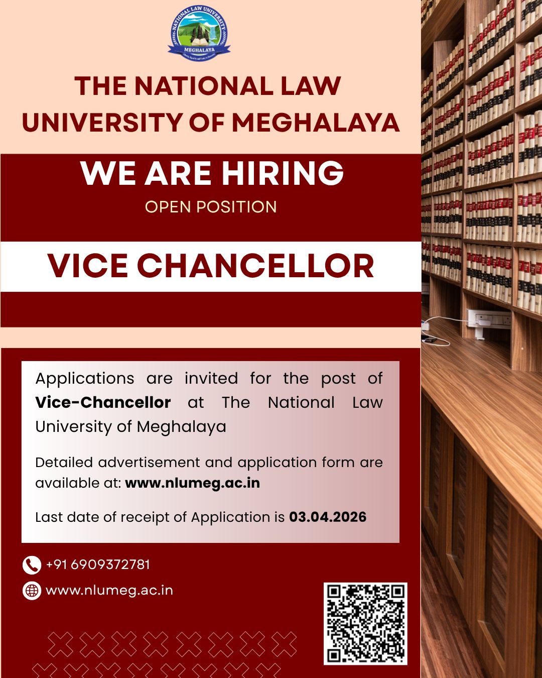 The National Law University of Meghalaya is inviting applications for the position of Vice-Chancellor. This is a senior academic leadership role suited for individuals with extensive experience in legal education, research, and institutional administration.