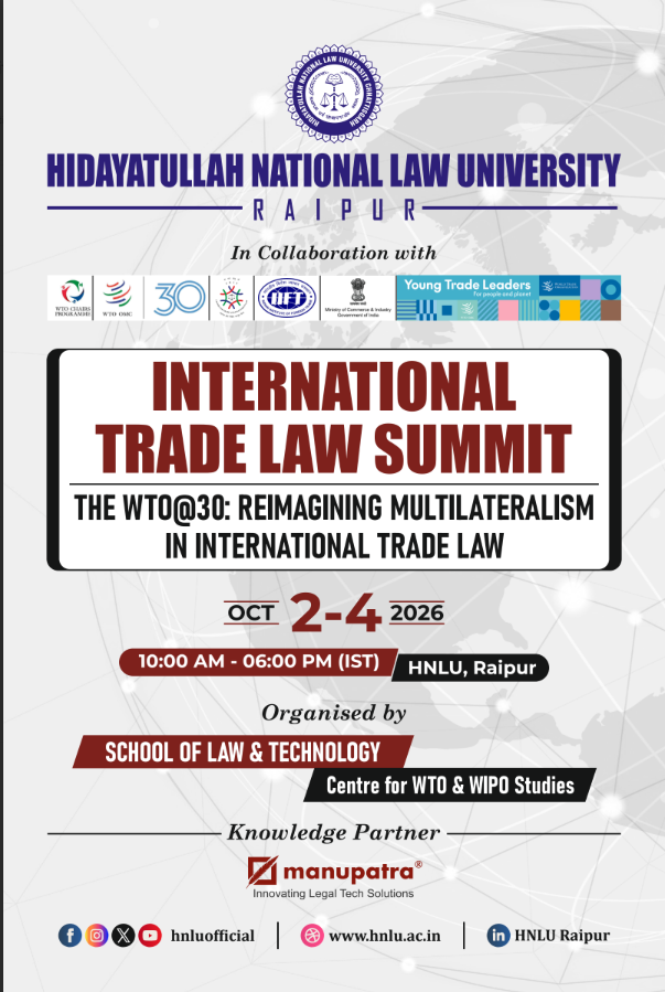 Hidayatullah National Law University (HNLU), Raipur, through its Centre for WTO & WIPO Studies, School of Law and Technology, in collaboration with the WTO Young Trade Leaders Programme and the Centre for Trade and Investment Law (CTIL), IIFT, under the WTO Chairs Programme of the Ministry of Commerce and Industry, Government of India is set to organise International Trade Law Summit on “The WTO@30: Reimagining Multilateralism in International Trade Law,” from 02 – 04 October 2026 in offline mode. To commemorate the 30th anniversary of the World Trade Organization (WTO), this Summit is designed as an outreach of the WTO Young Trade Leaders Programme and aims to foster global trade awareness and career opportunities for young professionals.
