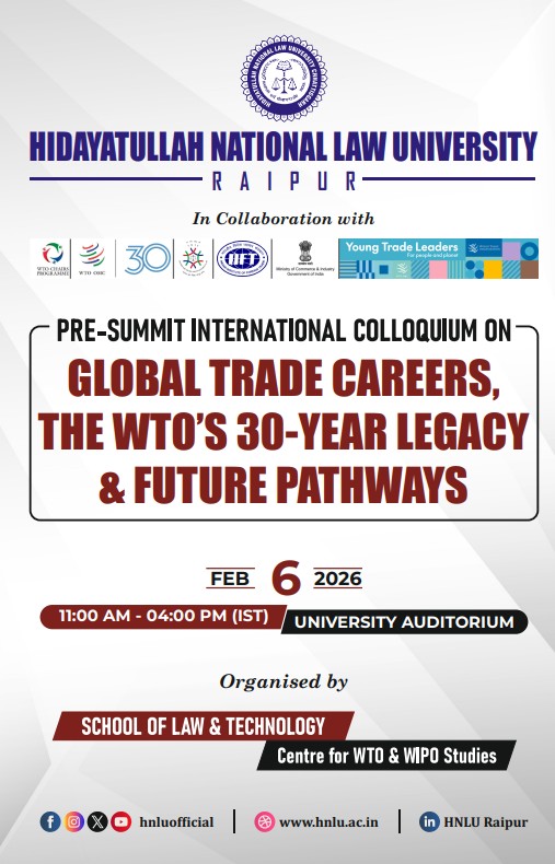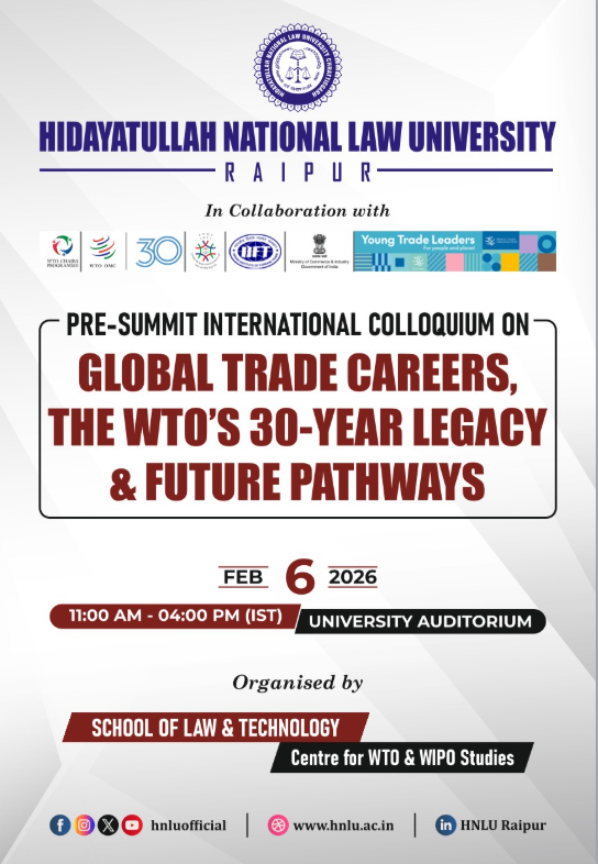 Hidayatullah National Law University (HNLU), Raipur, through its Centre for WTO & WIPO Studies, in collaboration with the WTO Young Trade Leaders Programme and the Centre for Trade and Investment Law (CTIL), IIFT, Ministry of Commerce & Industry, Government of India, under the WTO Chairs Programme, is set to host a three-day International Trade Law Summit titled “The WTO@30 Summit.”