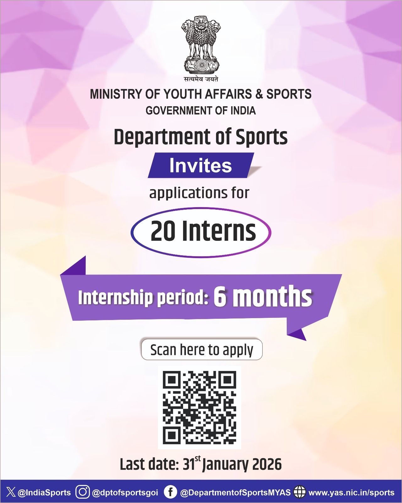 The Department of Sports, Ministry of Youth Affairs & Sports, Government of India, is inviting applications for its 6-Month Comprehensive Internship Programme.