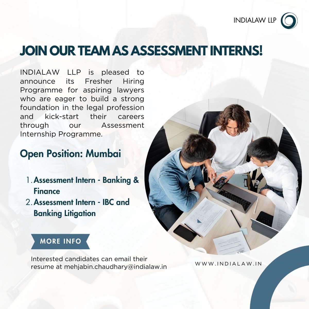 INDIALAW LLP is inviting applications for its Fresher Hiring Programme – Assessment Internship at the Fort, Mumbai office.