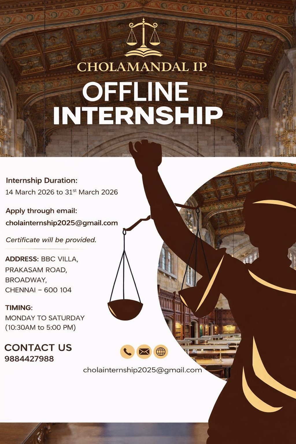 Cholamandal IP is inviting applications for an offline internship at its office in Chennai. This opportunity is suited for law students interested in gaining practical exposure to intellectual property and legal research within a professional legal environment.