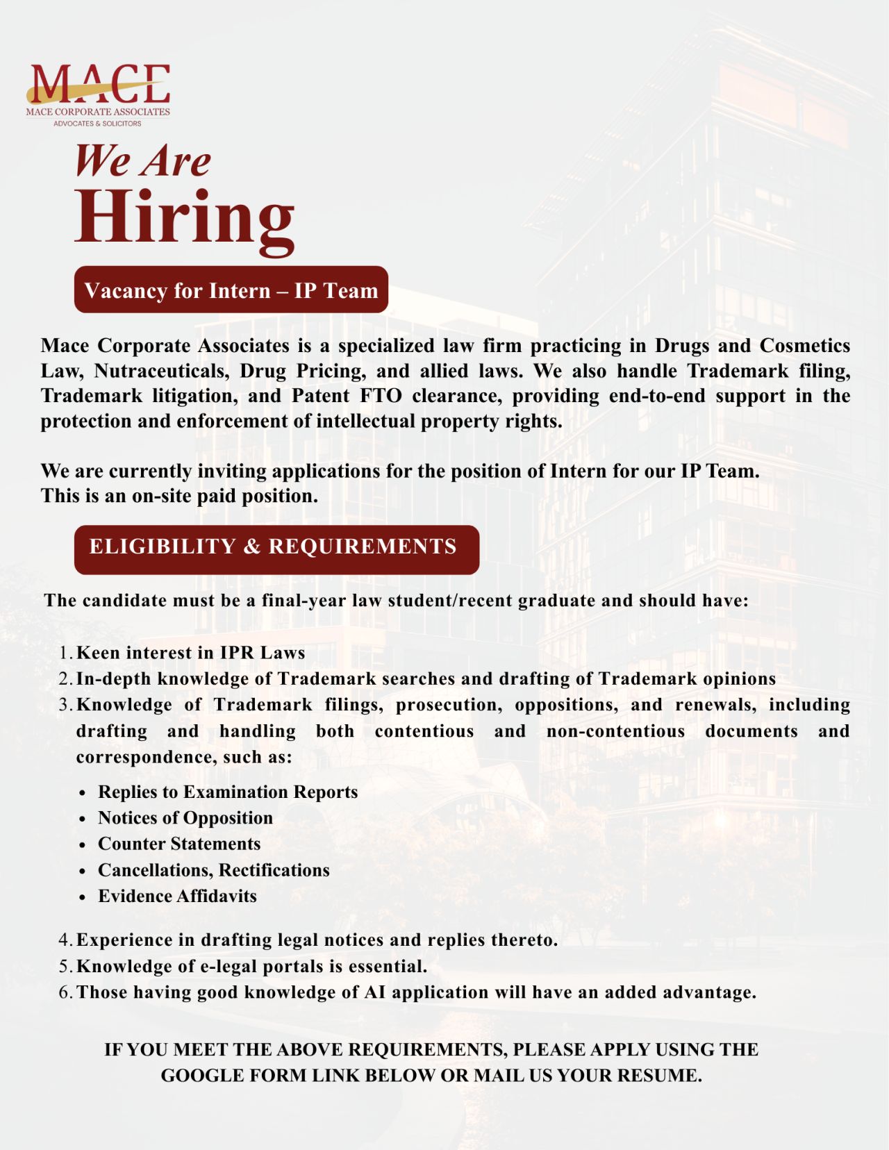 Mace Corporate Associates is inviting applications for the position of Intern – Intellectual Property Team. This is an on-site, paid internship offering hands-on exposure to trademark prosecution, litigation support, and allied IP work.