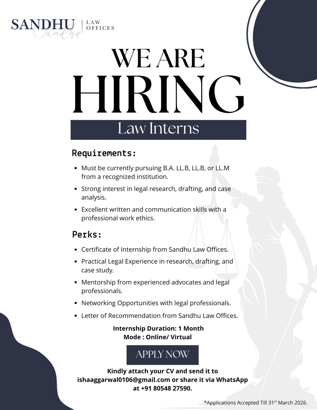 Sandhu Law Offices is inviting applications for Law Intern positions for a 1-month virtual internship, offering practical exposure to legal research, drafting, and case analysis.