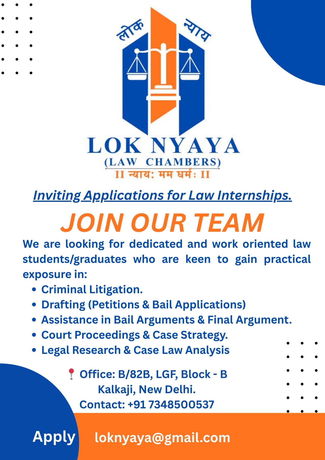 Lok Nyaya Law Chambers is inviting applications from dedicated and work-oriented law students and graduates seeking hands-on exposure in criminal litigation and courtroom practice.