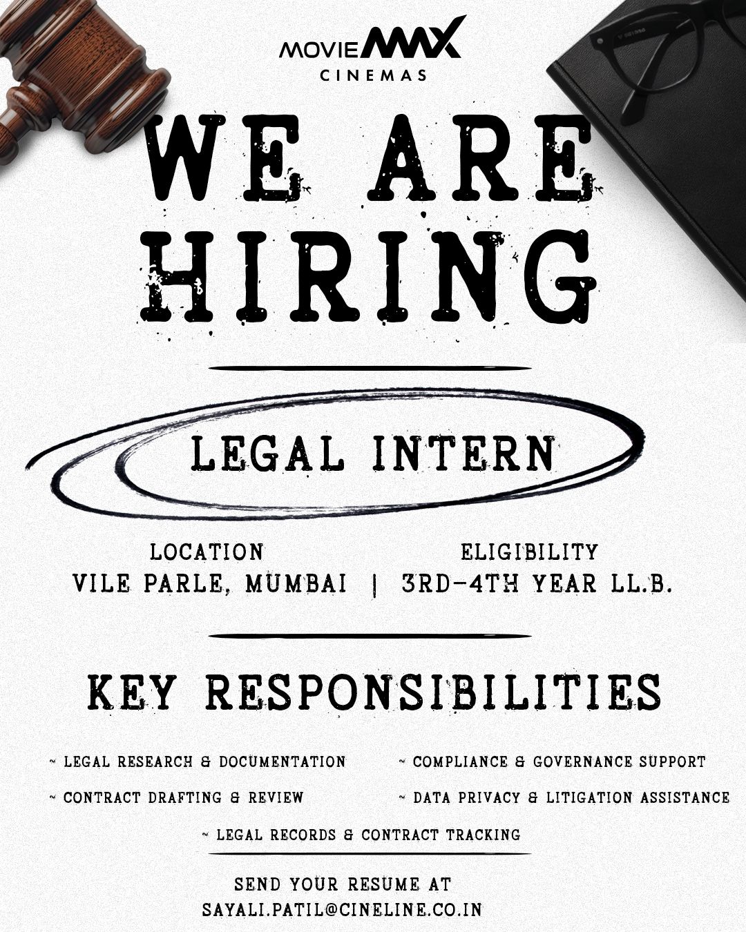 Cineline India Ltd. is inviting applications from law students for the position of Legal Intern at MovieMax Cinemas.