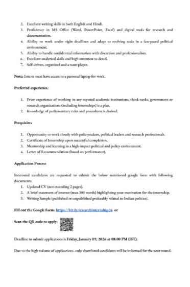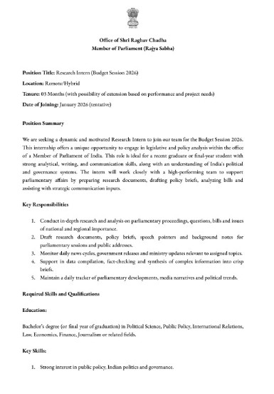 The Office of Shri Raghav Chadha, Member of Parliament, India, invites applications for Research Interns for the Budget Session 2026. This is a unique opportunity to gain hands-on exposure to legislative research, policy analysis, and parliamentary processes.