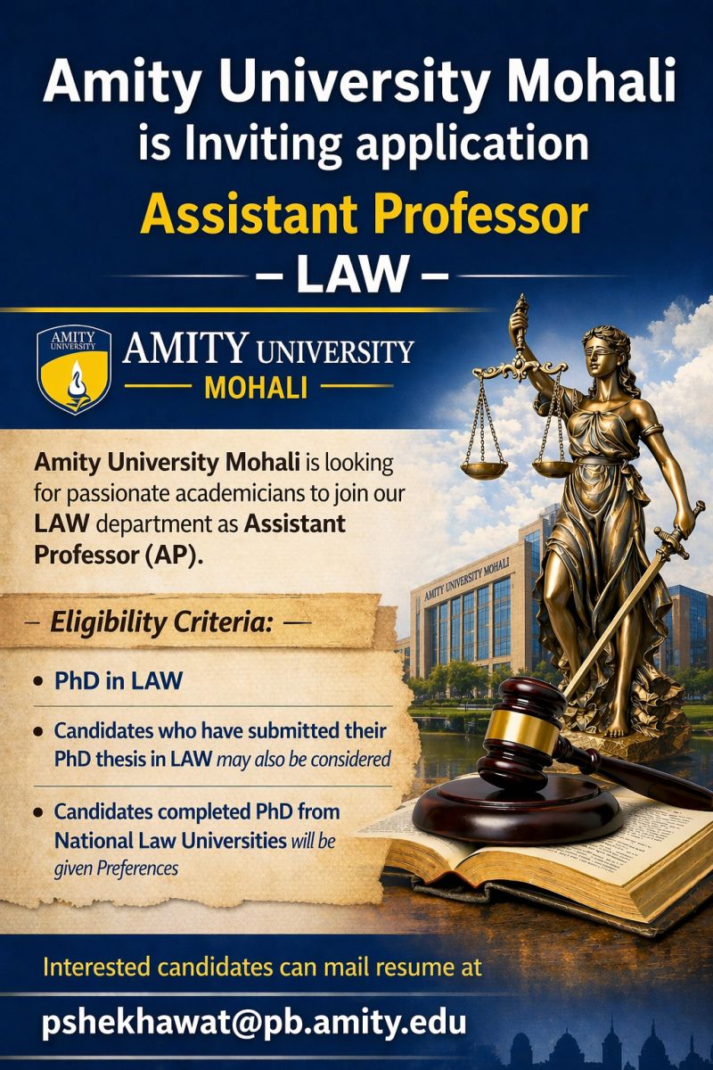 Amity University Punjab is inviting applications for the position of Assistant Professor – Law. This role is focused on teaching, research, and academic engagement, offering an opportunity to contribute to higher legal education and institutional development.