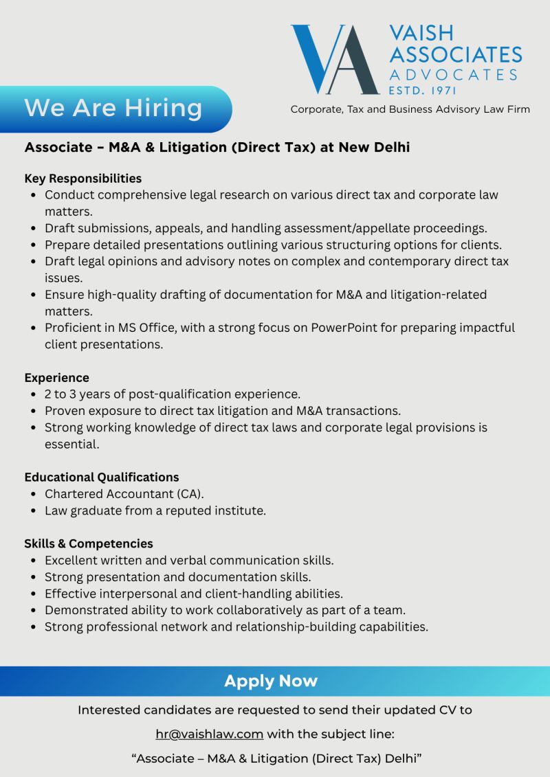 Vaish Associates Advocates is inviting applications for the position of Associate to join its M&A & Direct Tax Litigation Practice in New Delhi. This role offers a unique opportunity to work at the intersection of transactional advisory and tax litigation, making it ideal for candidates looking to build a specialised and dynamic legal career.