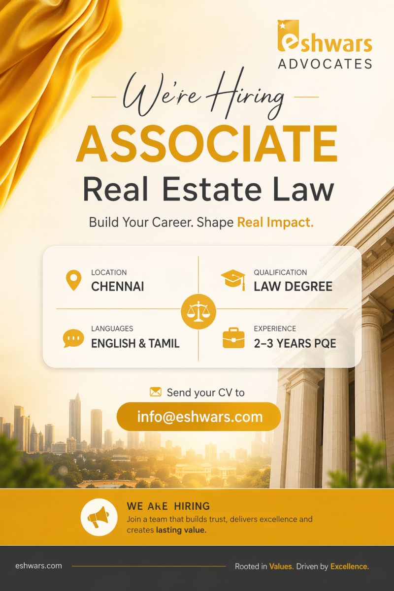 Eshwars Advocates is a Chennai-based law firm known for handling high-value real estate transactions and advisory work, offering practical exposure to property law, land due diligence, and regulatory compliance. The firm works closely with developers, investors, and individual clients on complex real estate matters.
