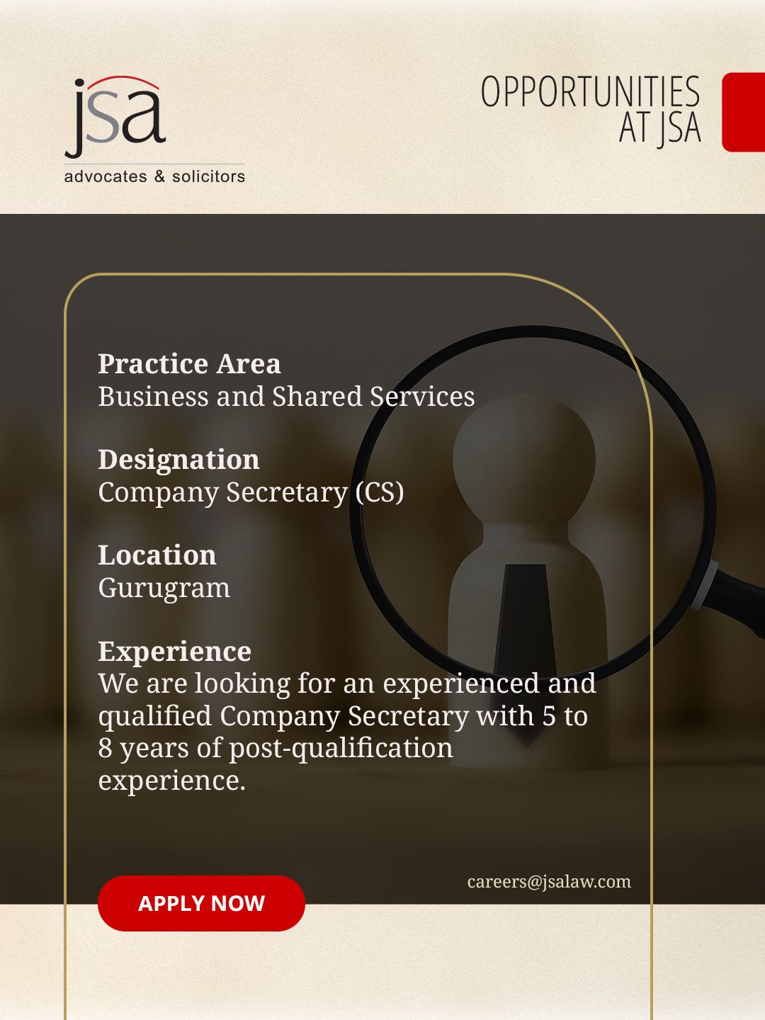 JSA is inviting applications for the position of Company Secretary (CS) to join its General Corporate and Commercial practice in Gurugram. This opportunity is suited for experienced professionals looking to work on corporate governance, regulatory compliance, and advisory matters within a leading law firm environment.