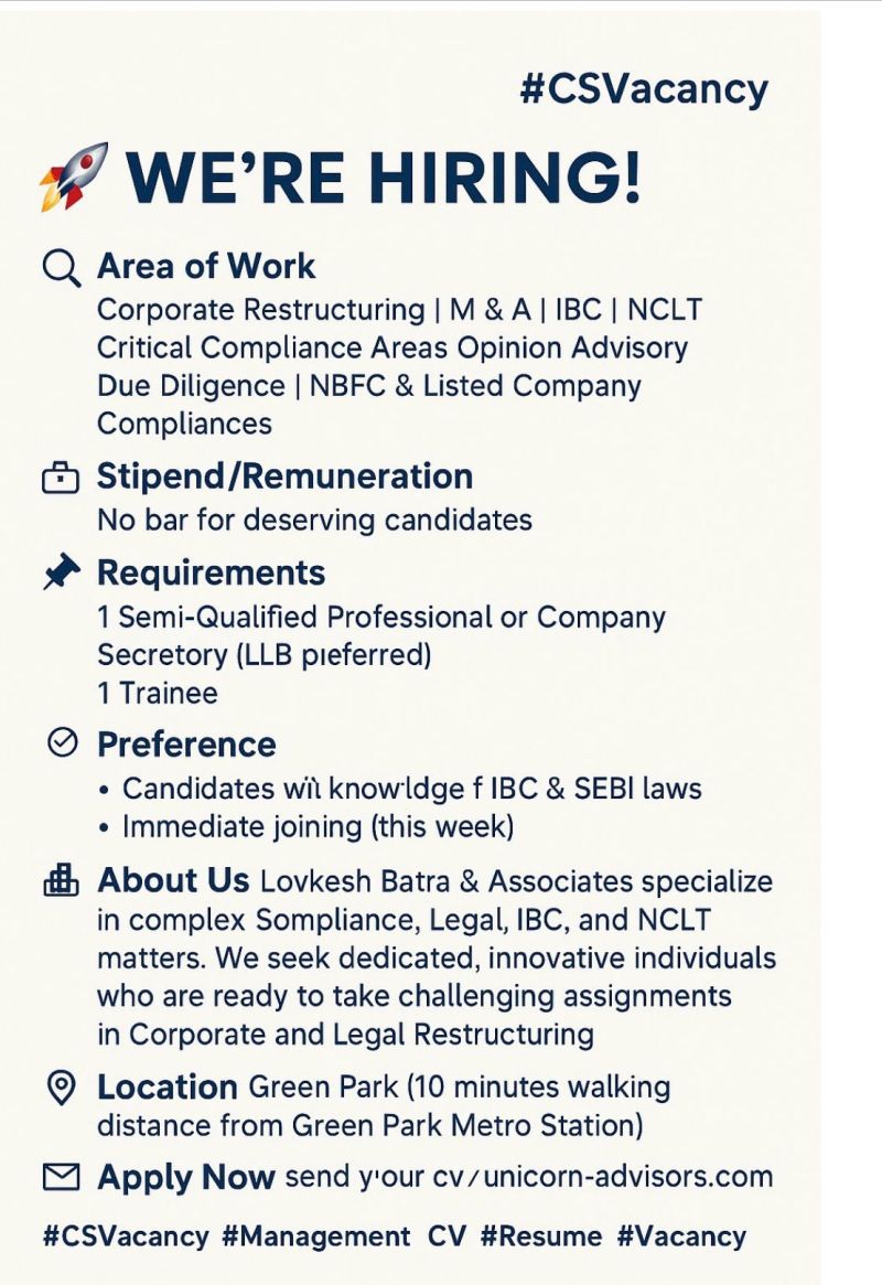 Lovkesh Batra & Associates specializes in Corporate Restructuring, IBC, SEBI compliance, M&A, NCLT/NCLAT matters, and critical compliance advisory. The firm works on complex, high-impact legal and corporate matters and is looking for dedicated professionals to join its team in New Delhi.