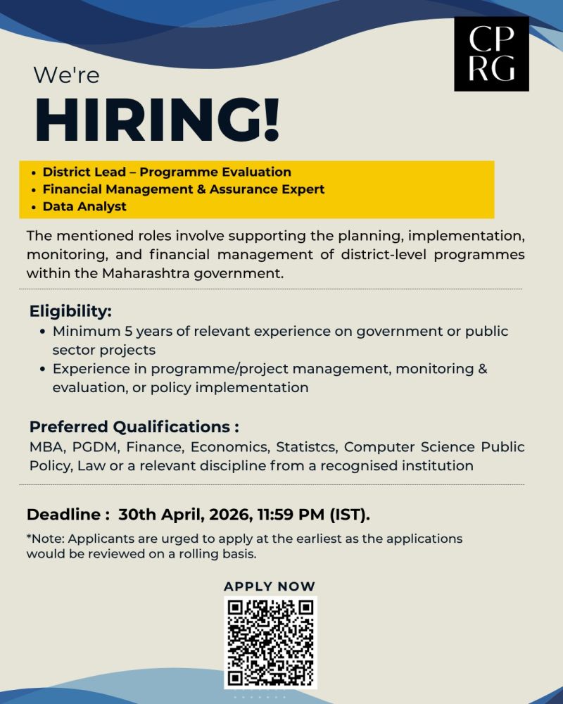 Center of Policy Research and Governance (CPRG) is inviting applications for multiple roles to support district-level programme implementation in Maharashtra, offering an opportunity to work closely with government initiatives and policy execution on the ground.