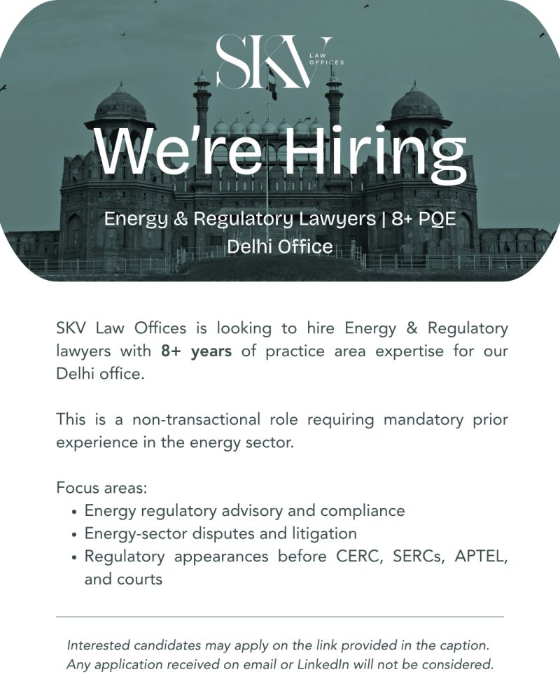 SKV Law Offices is inviting applications for experienced Energy & Regulatory Lawyers for its Delhi office. This is a non-transactional role focused on regulatory advisory, compliance, and dispute resolution in the energy sector.